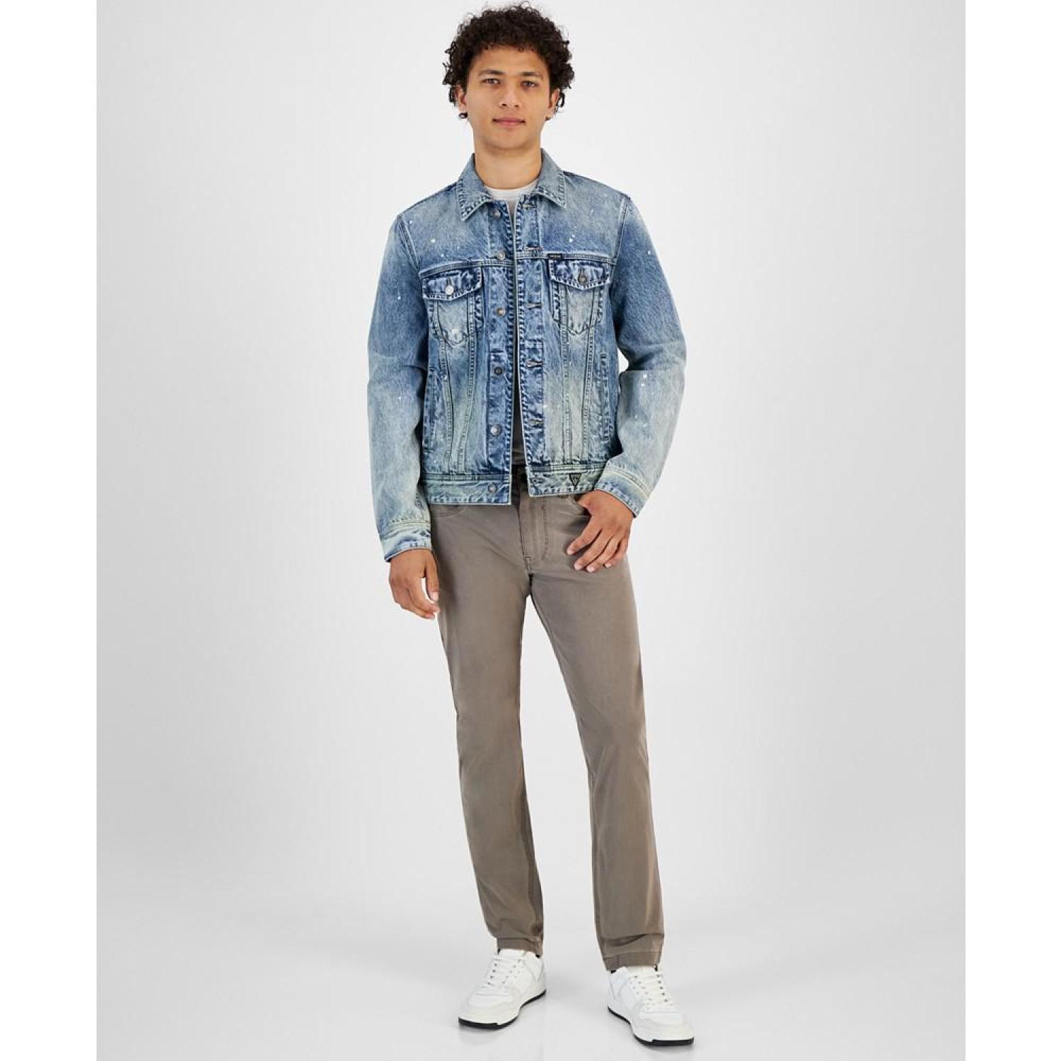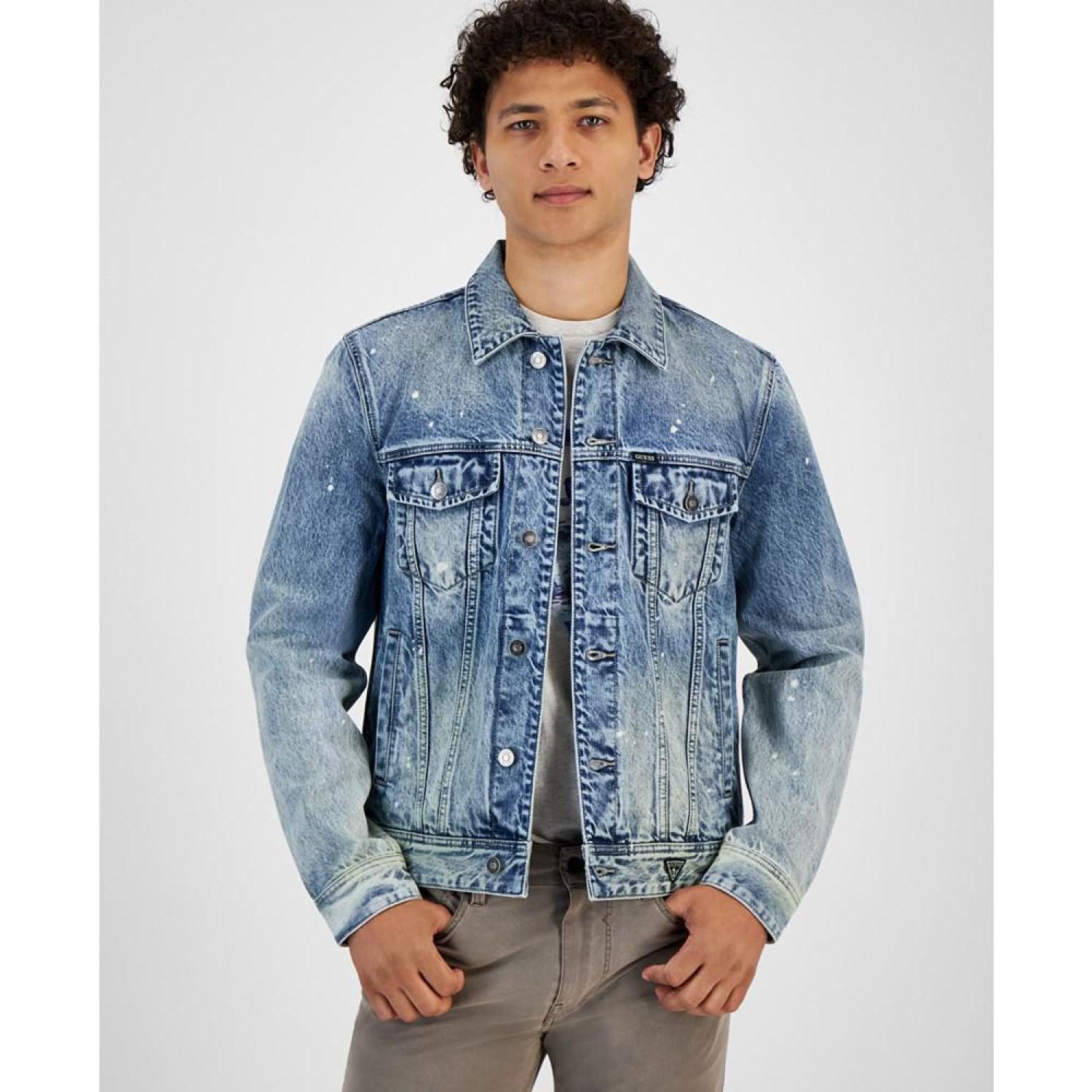 This light wash GUESS denim jacket features a folded collar, front pocket, button-down closure, and embroidery details.