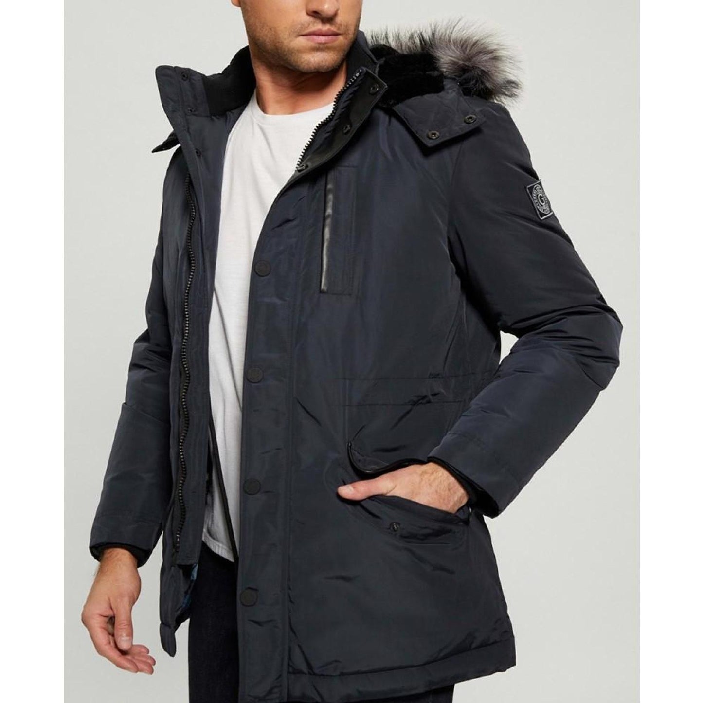 • This down parka features dual front pockets, front-button closure, and a faux-fur hood.