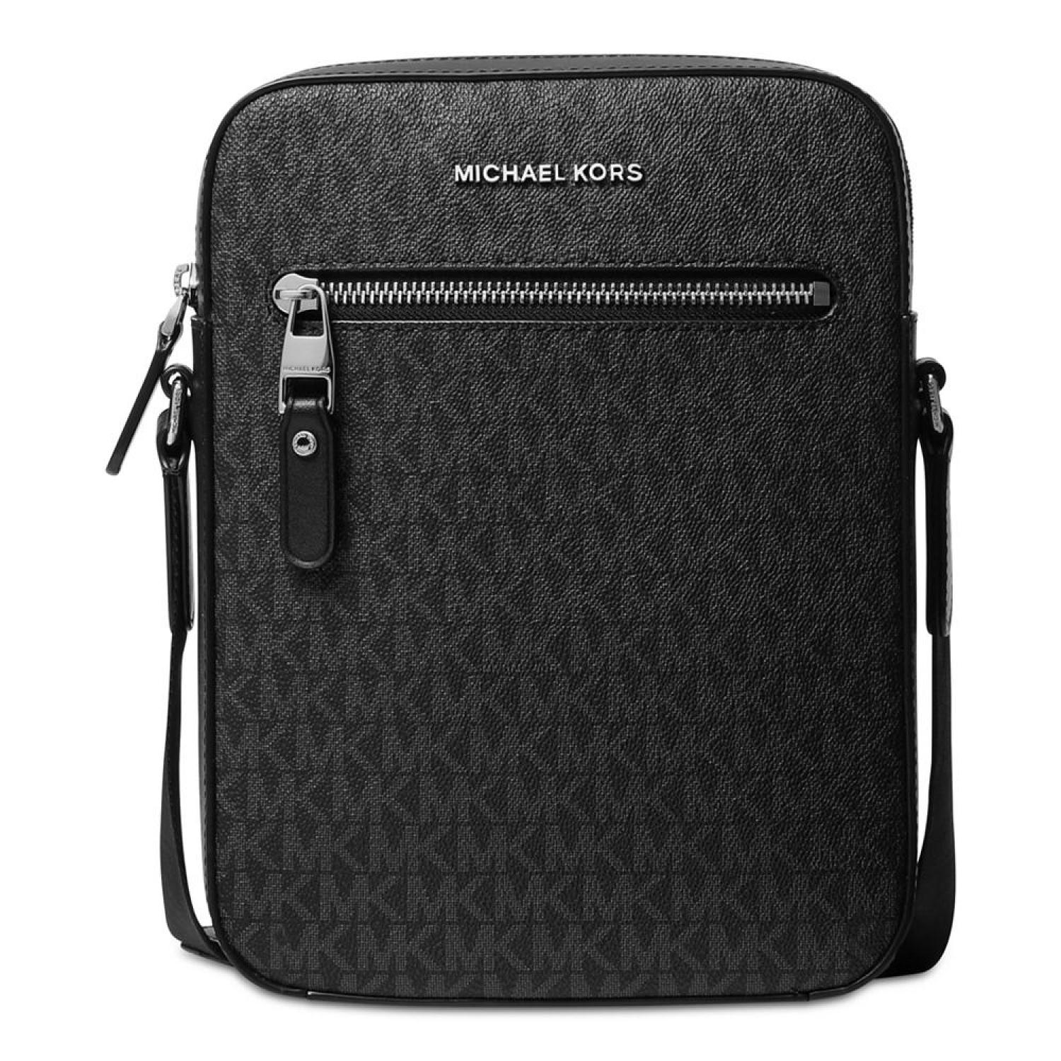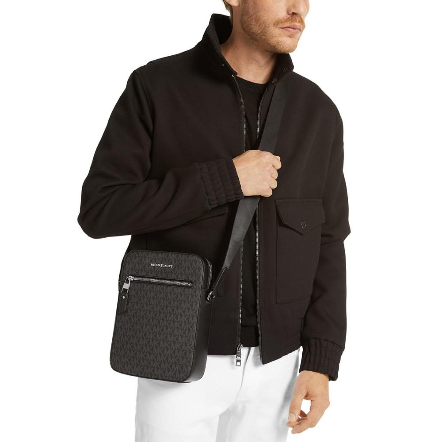 Perfect for the guy on the go, this Michael Kors flight bag includes padded protection for two phones and a tablet. A monogram print lends signature style. Small bag; approx. dimensions: 7-1/2"W x 9-1/2"H x 2-1/2"D Approx. 28" strap Zipper closure Logo and pocket at front Lined interior with padded phone and tablet pockets 89.4% PVC, 9.6% polyester, 1% polyurethane; lining: 100% polyester Spot clean only Imported