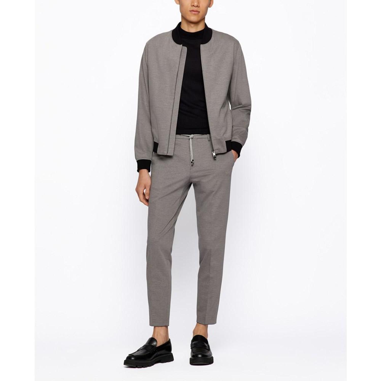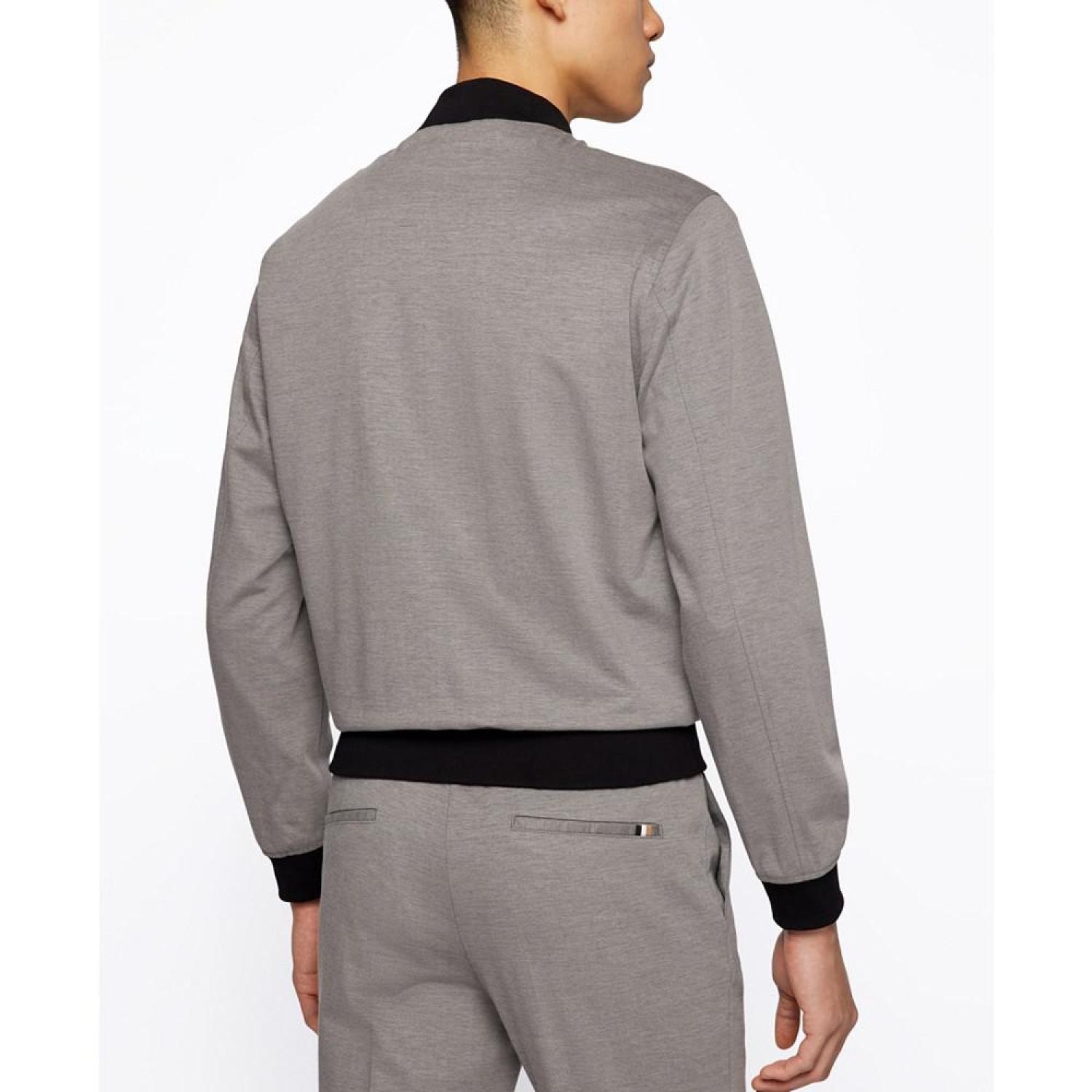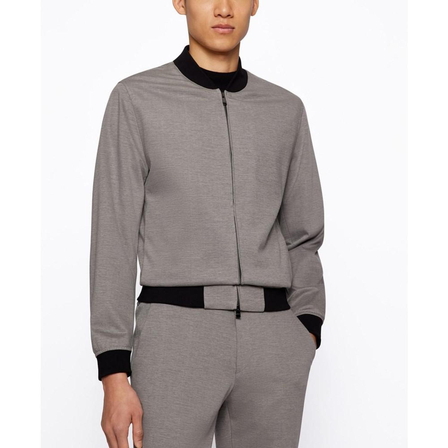 • A zip-up jacket by BOSS Menswear. Trimmed with contrast accents for a contemporary approach, this tailored jacket is cut to a streamlined fit in cotton-blend material with a melange texture. The interior is detailed with a signature stripe.