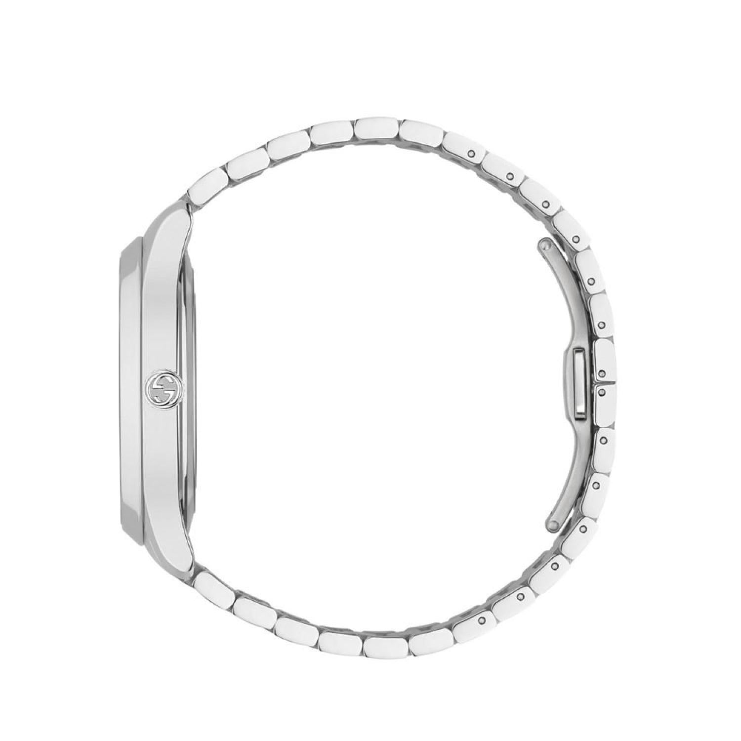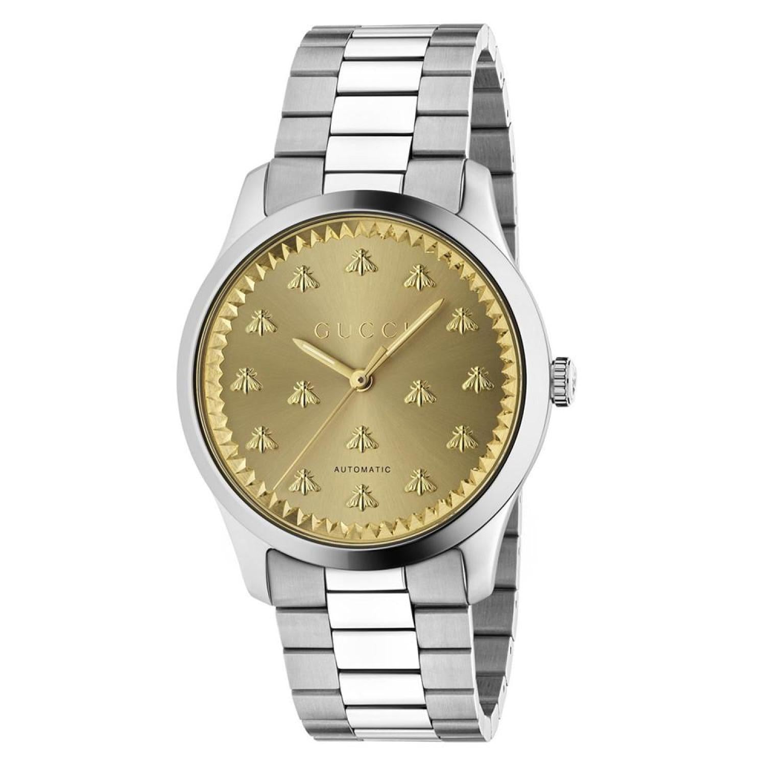 • Gucci's iconic bees buzz along a golden dial on this luxurious G-Timeless watch. Style #YA126378