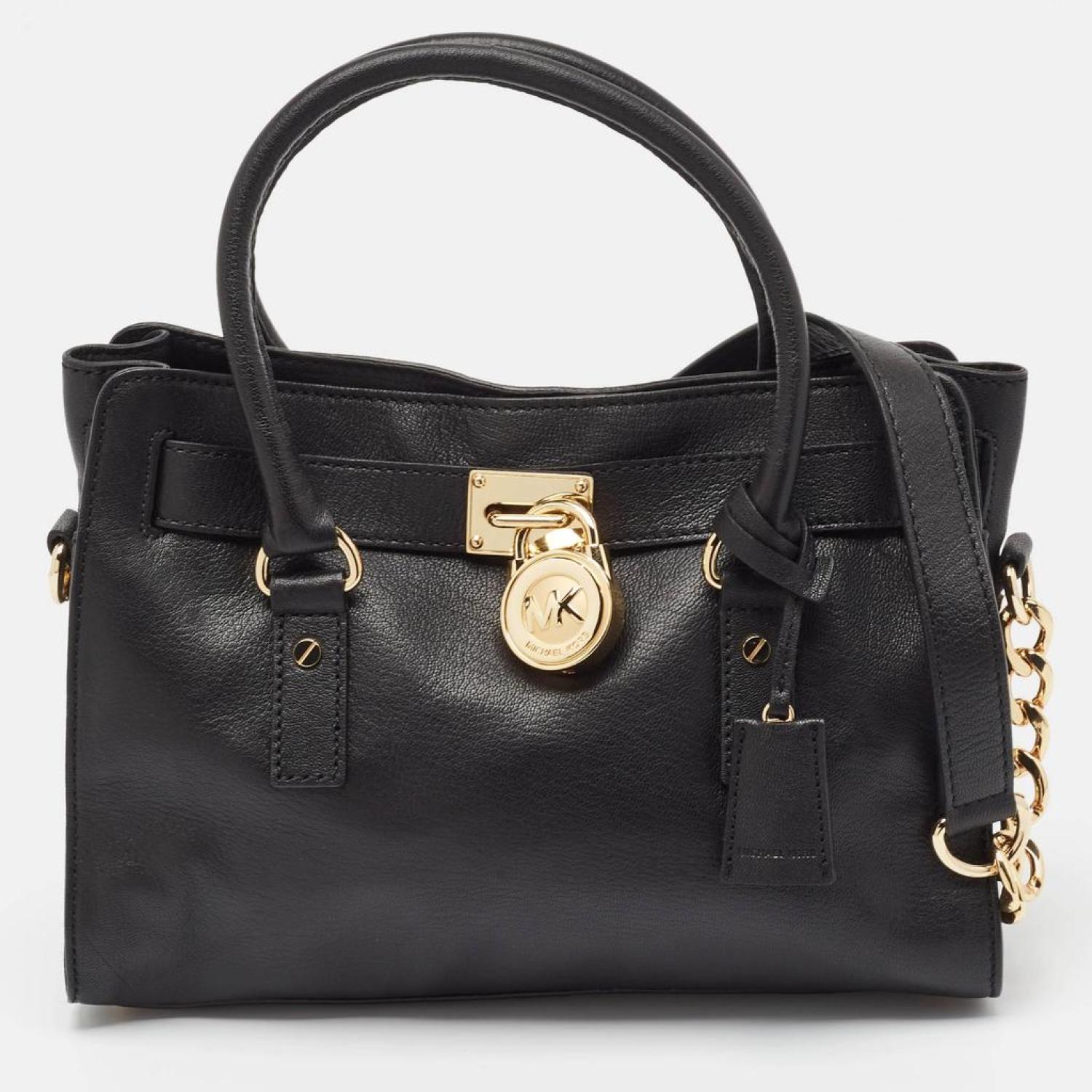 • This Hamilton tote is from MICHAEL Michael Kors. It is crafted from black leather and decorated with an engraved padlock on the front. The bag has two handles a shoulder strap and a spacious fabric interior. This creation is ideal for everyday use.