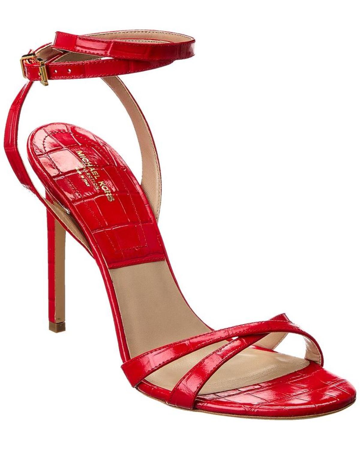 • Elevate your style with the Michael Kors Collection Chrissy Runway Croc-Embossed Leather Sandal. This stunning sandal features a strappy design in poppy croc-embossed leather and gold-tone hardware, exuding effortless glamour and luxury. The adjustable ankle strap with buckle closure ensures a perfect fit, while the lightly padded leather insole provides comfort with every step. The smooth leather sole and 4.5-inch heel add a touch of sophistication to any outfit. Made in Italy, these sandals offer all-American style for easy glamour and luxurious living. Please note that size selections are European, so be sure to reference the size chart for US conversions. All measurements are approximate and were taken from a size 40.5, with slight variations possible. Make a statement with these chic sandals from Michael Kors Collection.