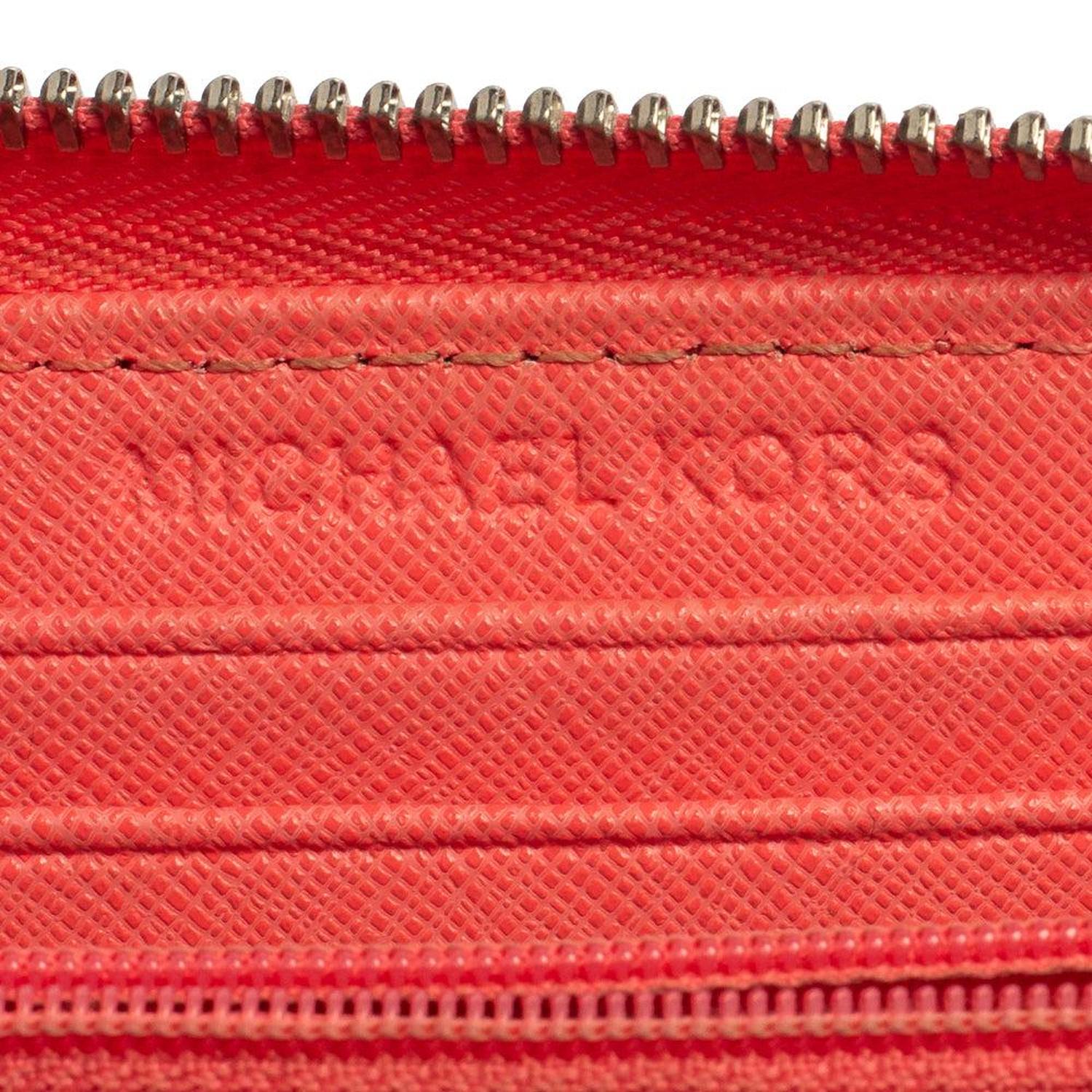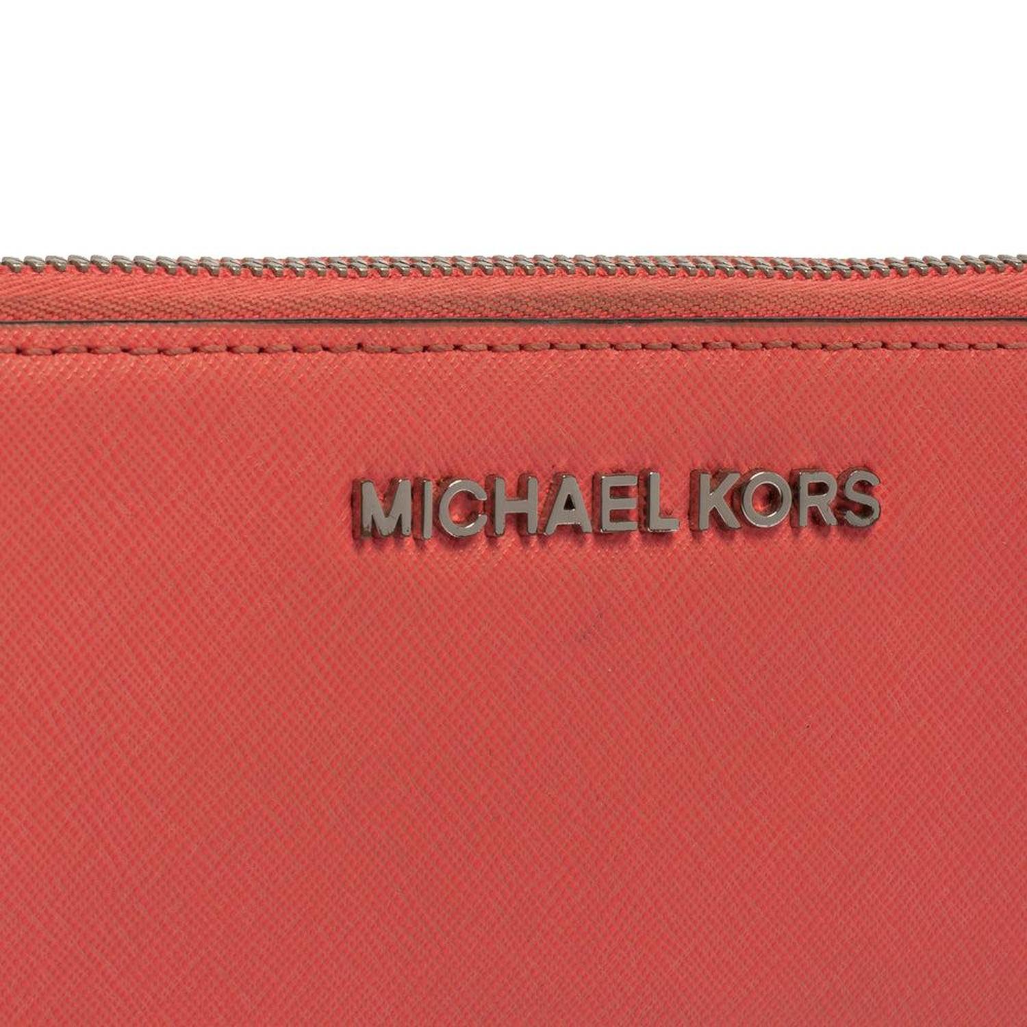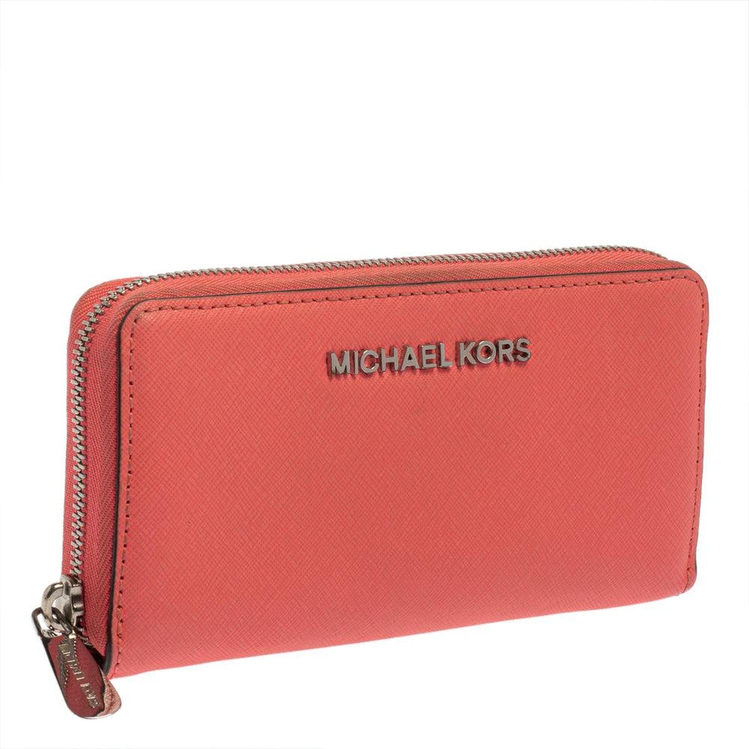 • This wristlet wallet by Michael Kors makes for a great accessory. It is crafted from pink leather features a zip closure that opens to a fabric and leather interior that can hold all your essentials in an organized manner. It is finished with silver tone hardware.
