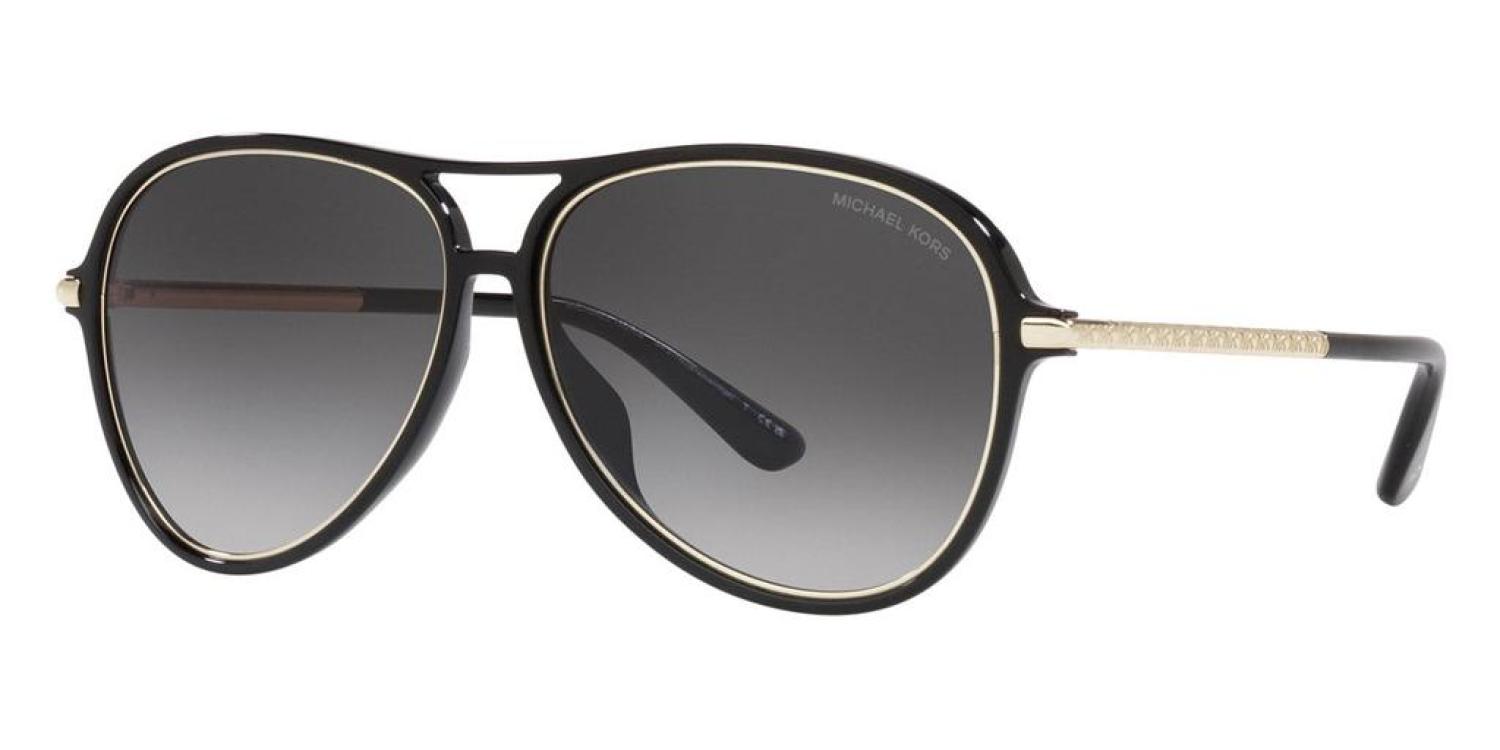 The Michael Kors women's sunglasses measure at 58mm lens width, bridge width, and 140mm arm length. The frame is aviator-shaped black. The lenses are non-polarized dark grey gradient. Made in China. (MK2176U-30058G-58)