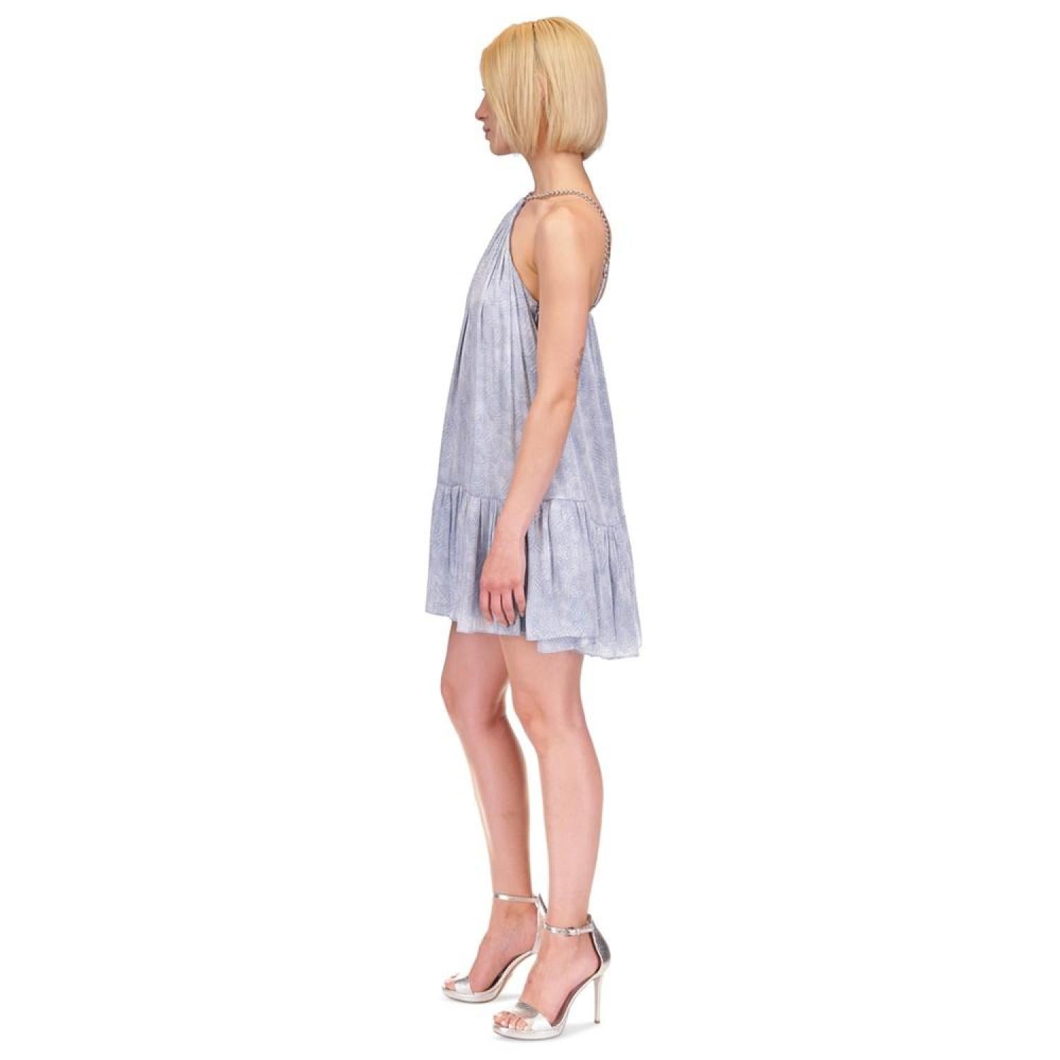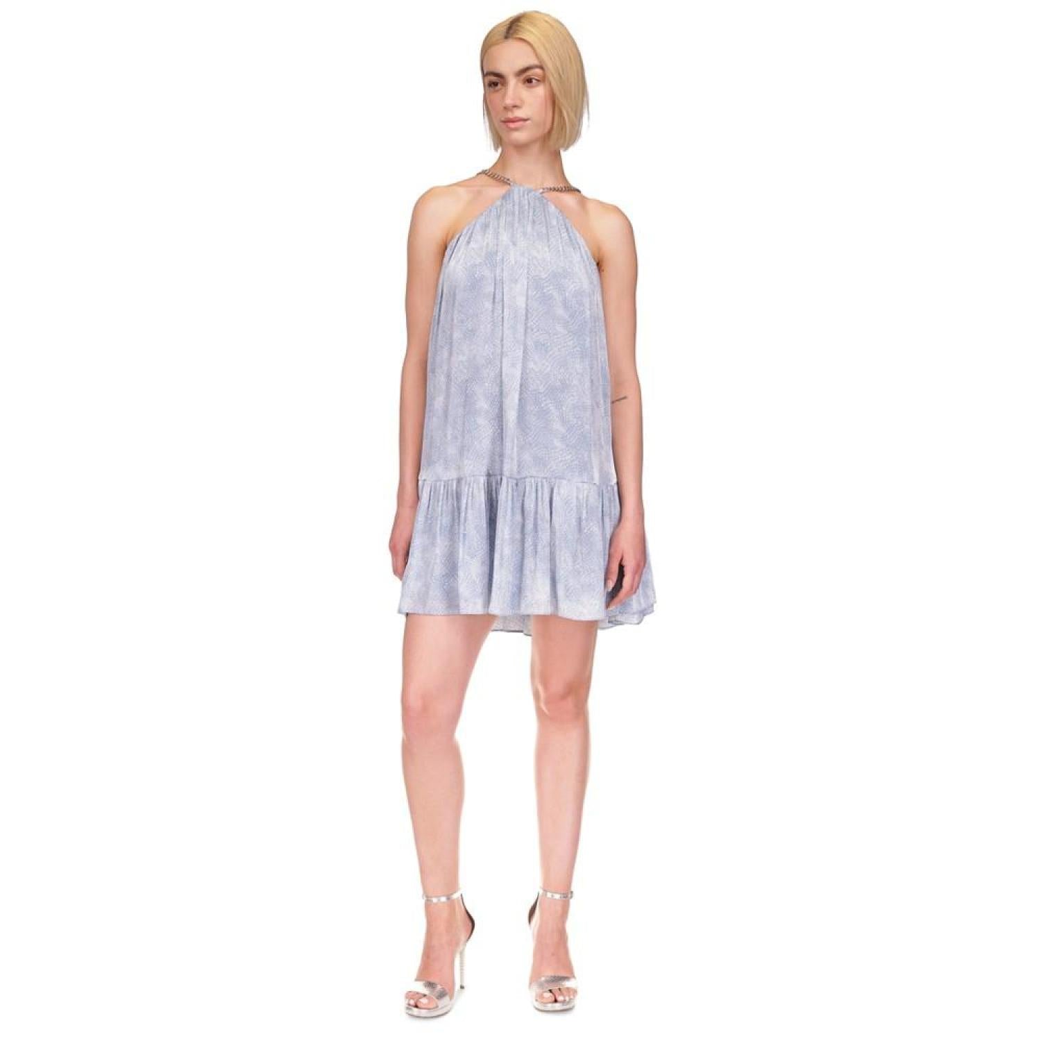 Dazzle the crowd in this gorgeous mini by Michael Kors, thanks to a iridescent finish on this halter-neck gem. Approx. 32-1/4" long from center back neck to hem. Mini silhouette Halter neckline with chain detailing; Mini silhouette Zipper with hook-and-eye closure at back Sleeveless Iridescent petal print Lined Shell & lining: polyester Machine wash Imported