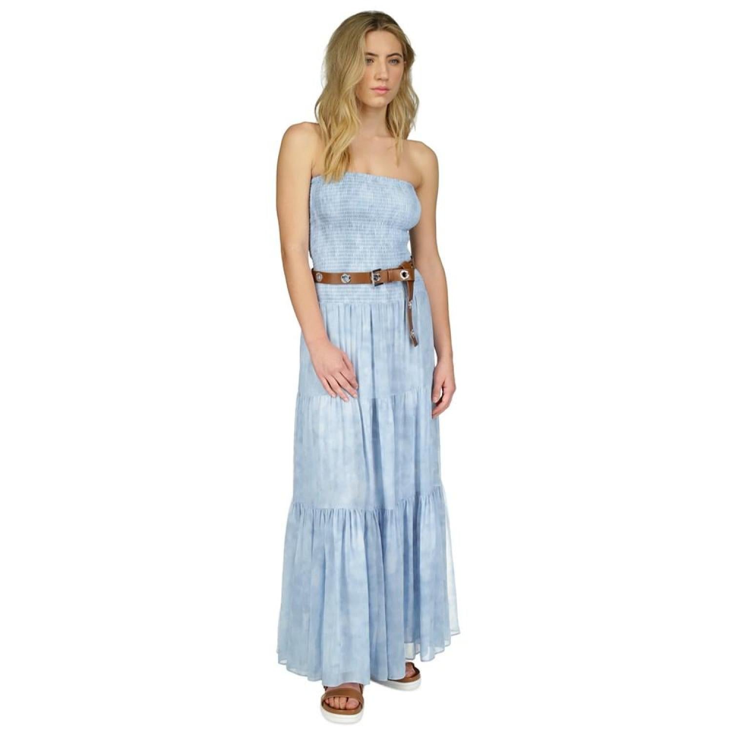 A smocked bodice lends a fitted silhouette to this flawless maxi dress by Michael Kors, a chic belt perfectly defines the waist which flows onto a tiered skirt.
