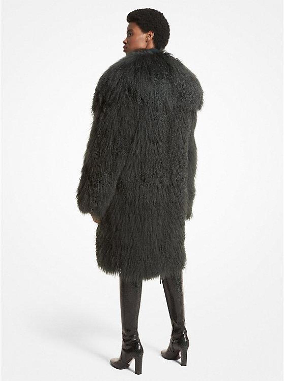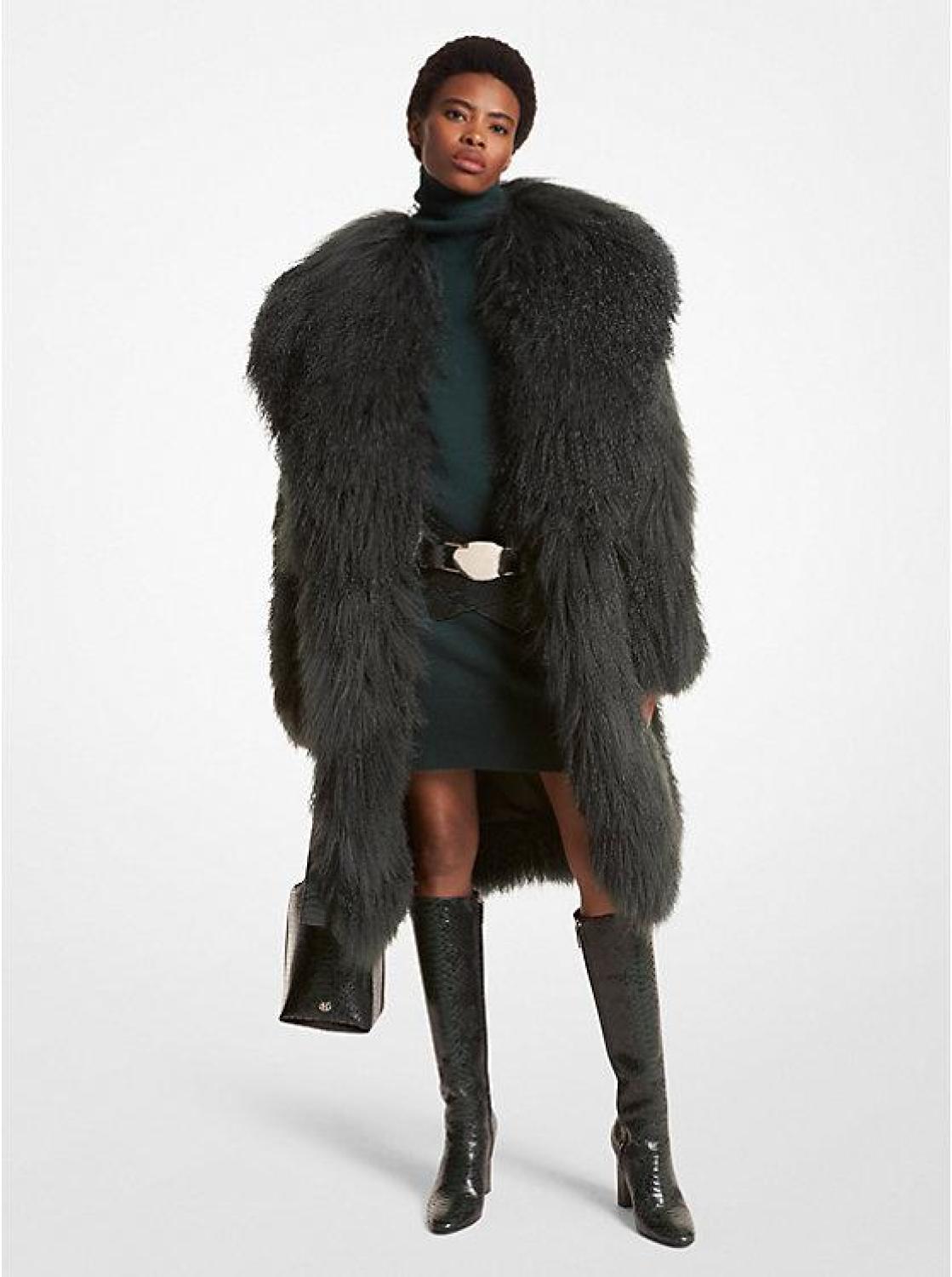 • As seen on the Fall/Winter 2023 runway, this shawl collar coat is an instant show-stopper. The luxuriously plush style is constructed from brushed lamb shearling in an oversized, knee-grazing silhouette that delivers plenty of warmth. Style yours with a tonal dress and accessories for an elevated ensemble.