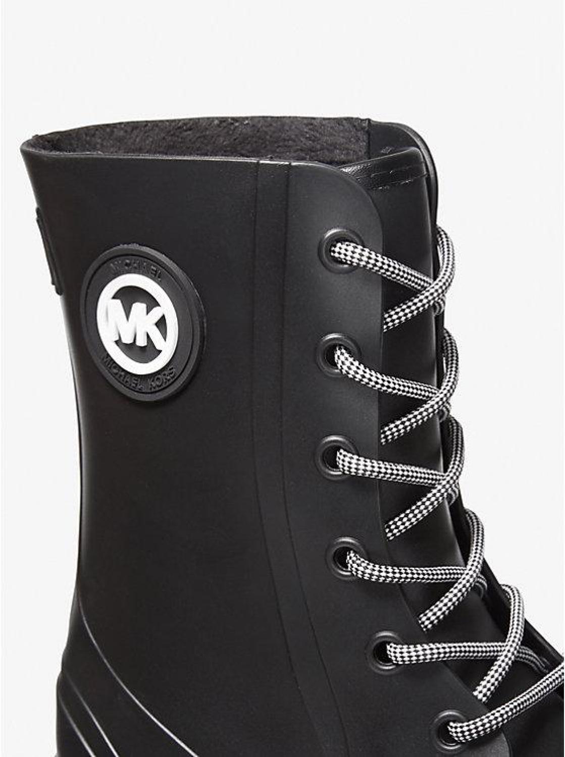 • The Montaigne rain boots are defined by our iconic “MK” charm and two-tone laces that stand out against the sleek silhouette for a cool, novelty feel. They’re crafted from waterproof PVC and set on sturdy gripped rubber soles. Inside lining not only adds extra warmth, but ensures a close, cozy fit, too.