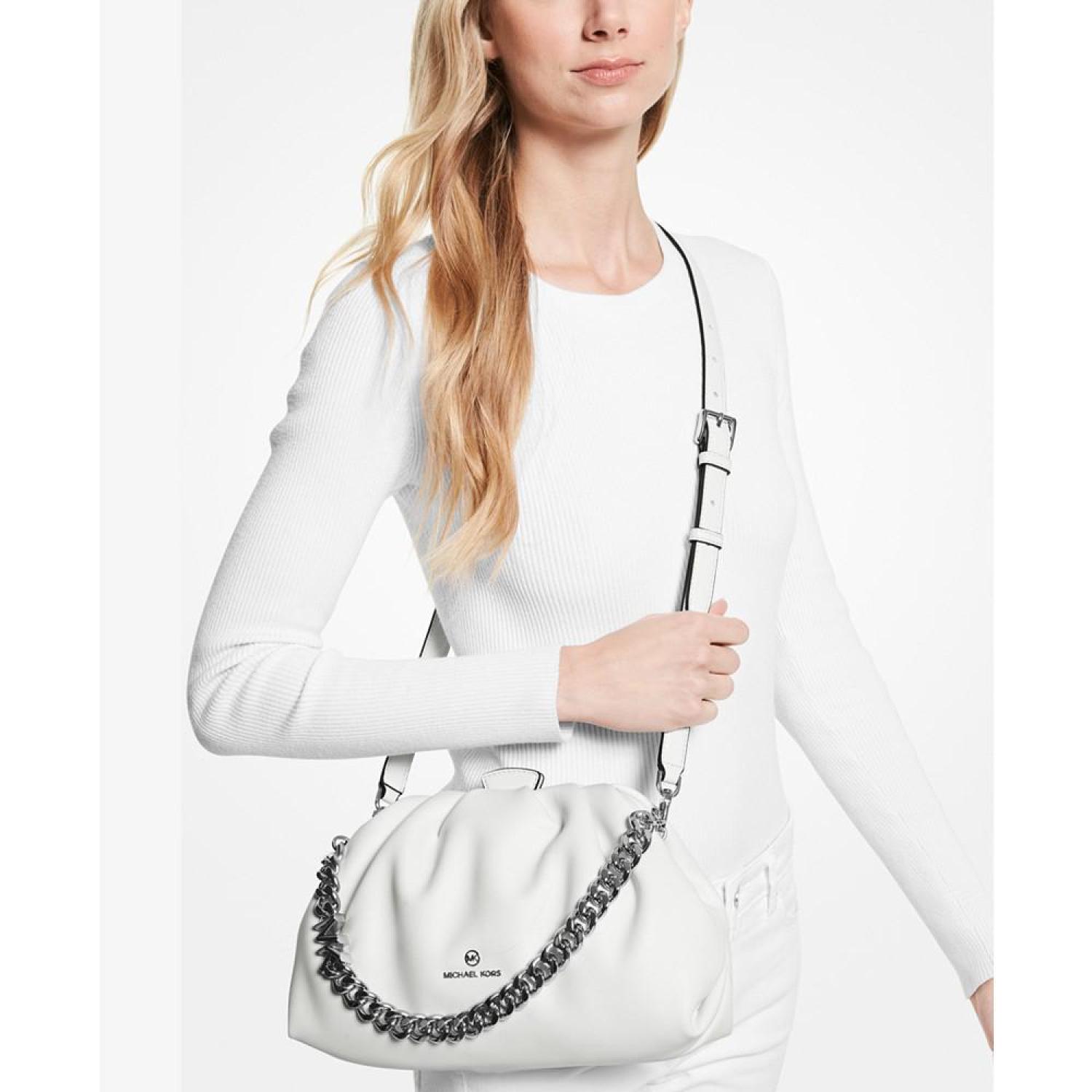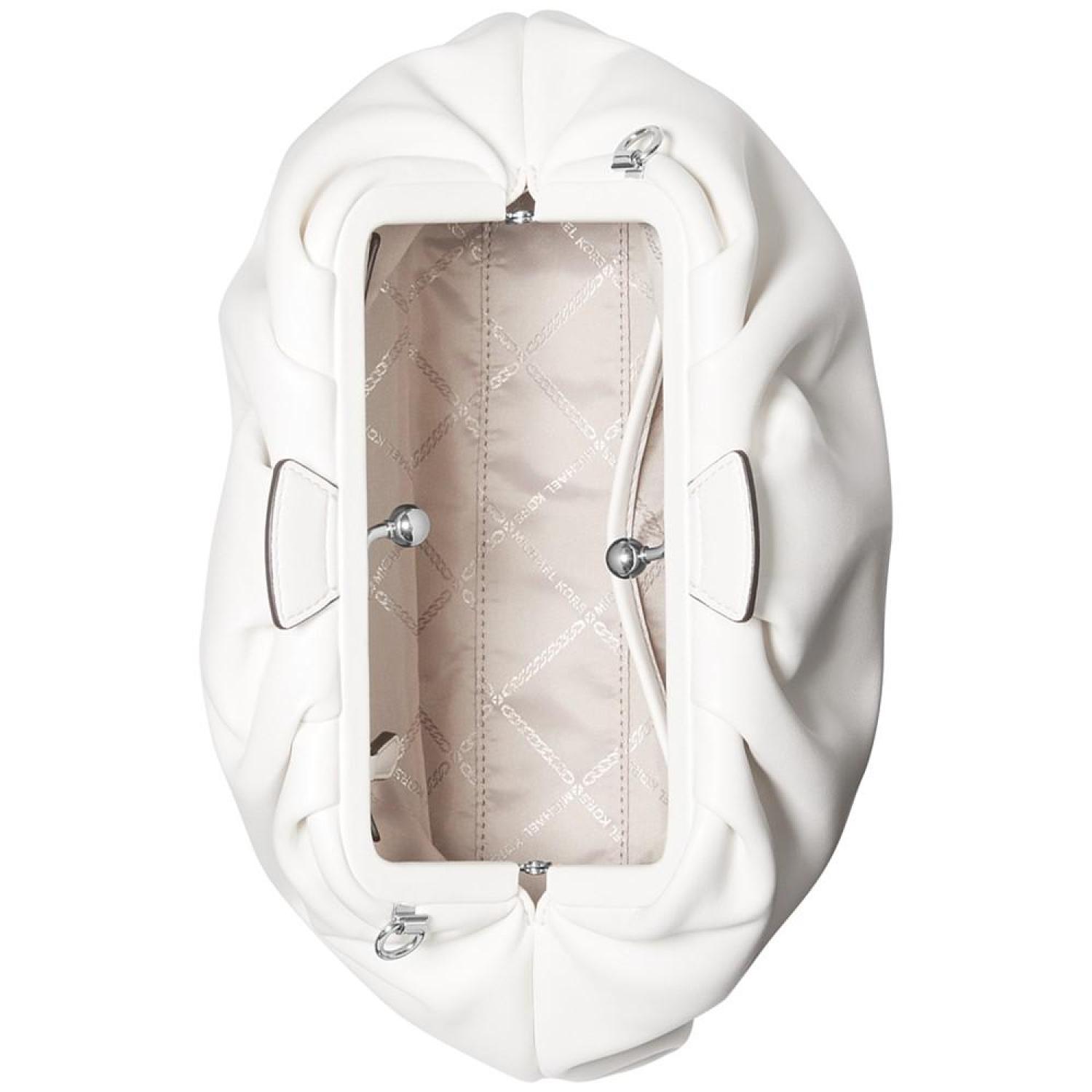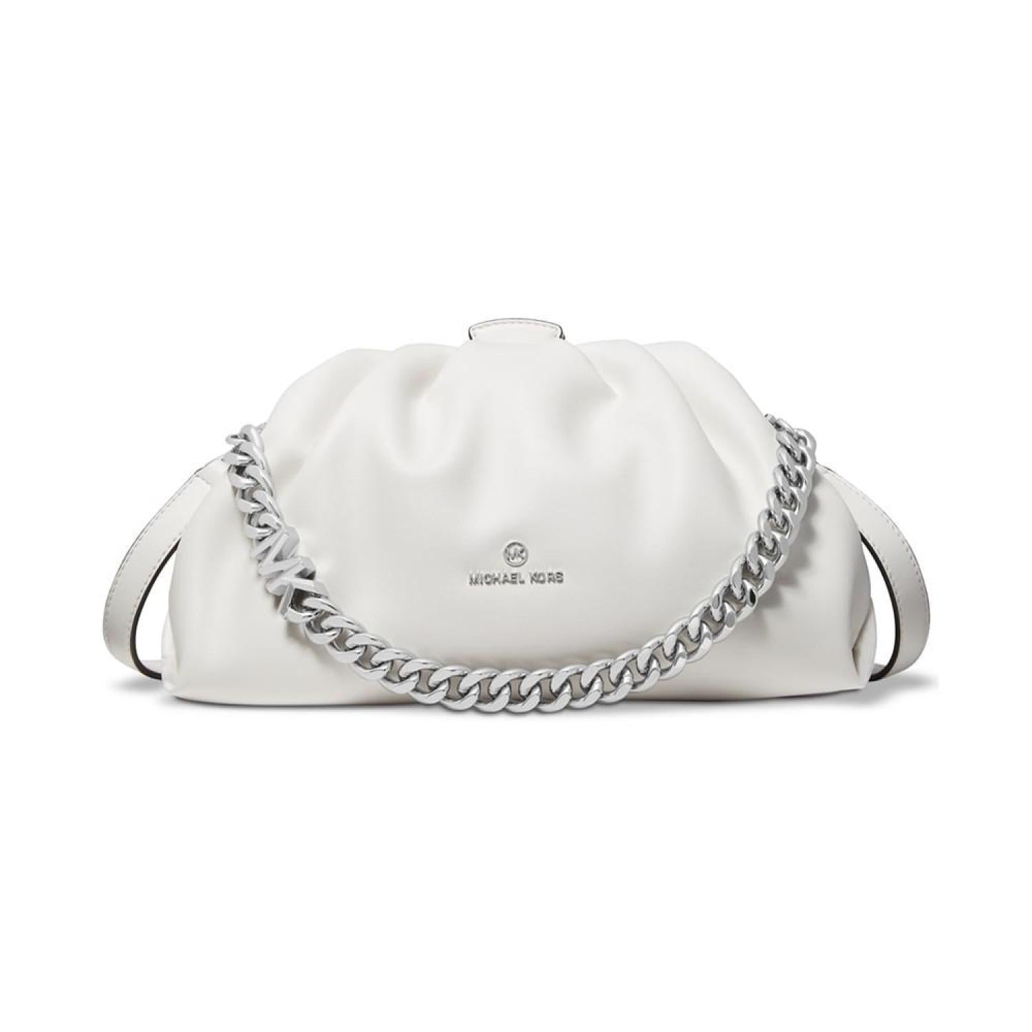 MICHAEL Michael Kors Nola Clutch Crossbody Medium sized bag; 12"W x 7.25"H x 5.5"D (width is measured across the bottom of handbag); 1.12lbs. approx. weight Silhouette is based off 5'9" model Magnetic closure Interior interior 1 back zip Pocket, 1 front slip pocket 75% Pu, 20% Polyester, 3% Calcium Carbonate, 2% Wood Fiber Powder Spot clean Imported