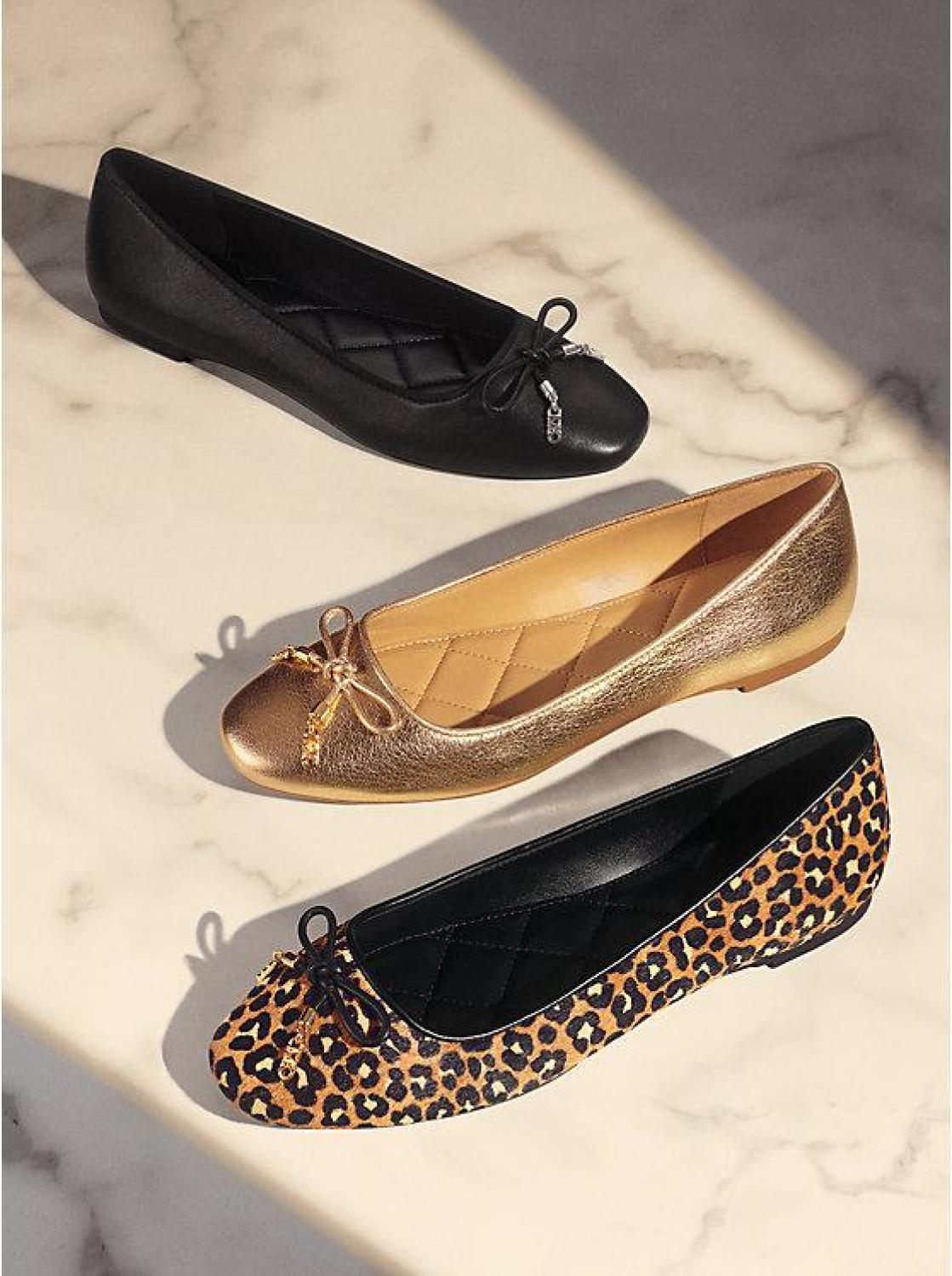Meet Nori: an undeniably chic, timeless ballet flat. Featuring a bow at the toe accented with minimal hardware, this elegant pair is crafted from bold leopard-print calf hair in a classic silhouette that gently molds to your foot with wear. Make them your wear-with-everything shoe, from dresses to denim.