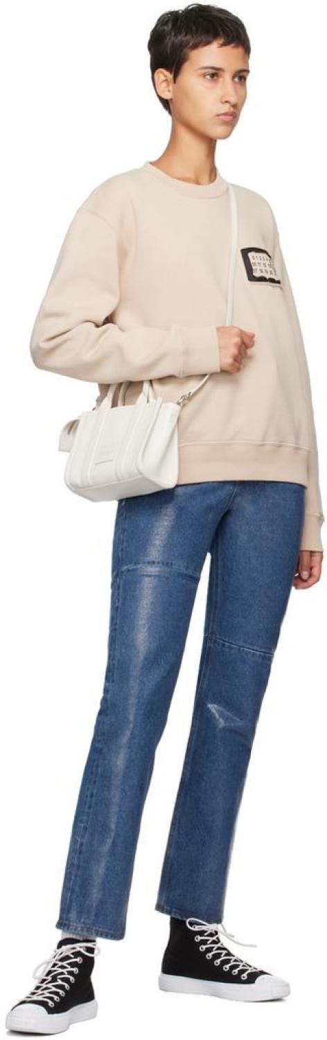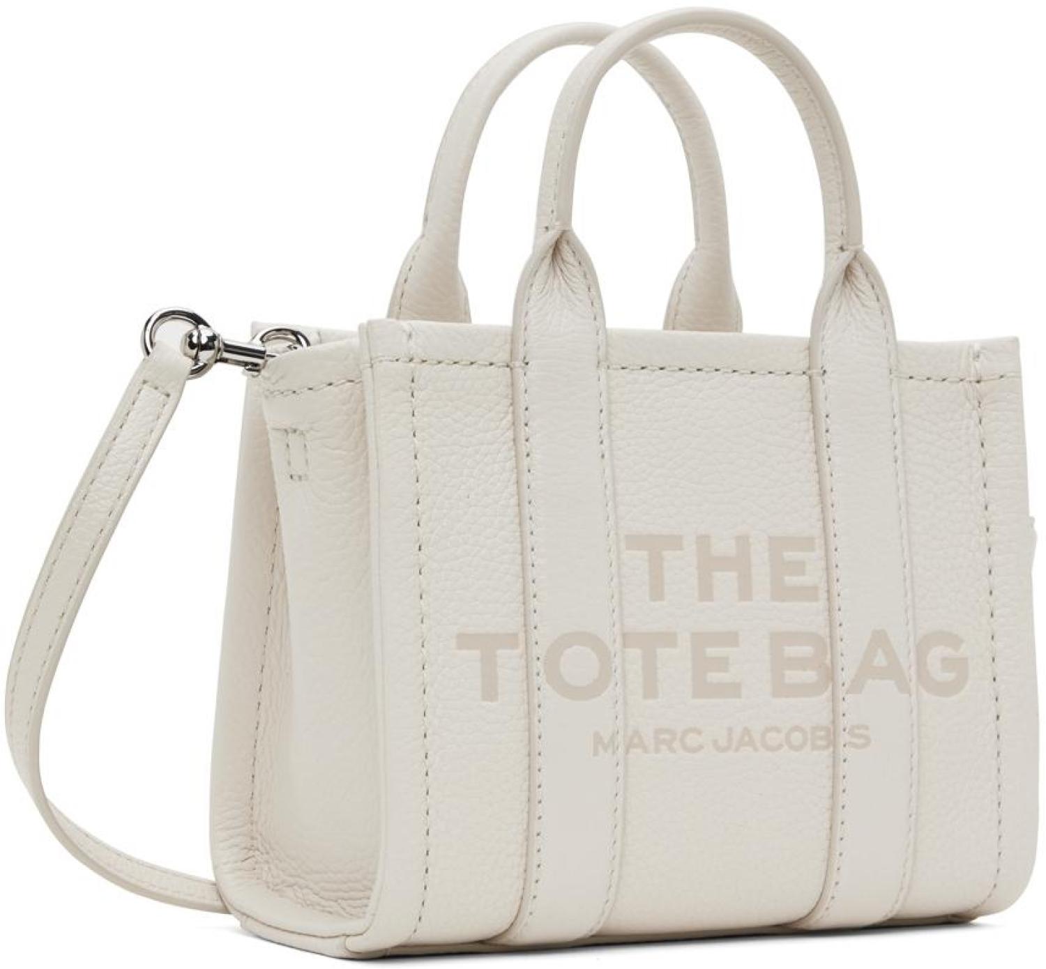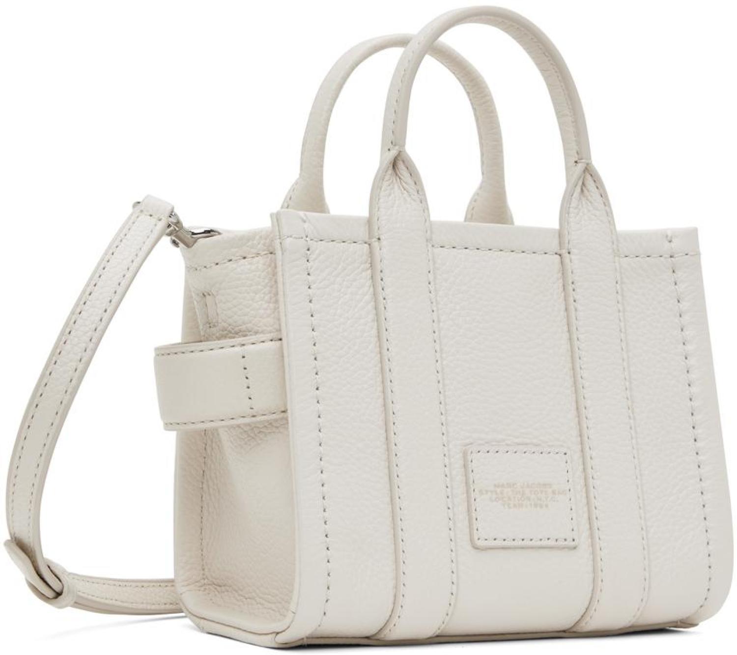 Marc Jacobs Off-White 'The Leather Mini Tote Bag' Tote Grained leather tote in off-white. · Twin rolled carry handles · Adjustable and detachable crossbody strap · Logo embossed at face · Carry handle at side · Logo patch at back face · Zip closure · Unlined · H6" x W7" x D4" Supplier color: Cotton/Silver Leather. Made in Viet Nam. 241190F049081
