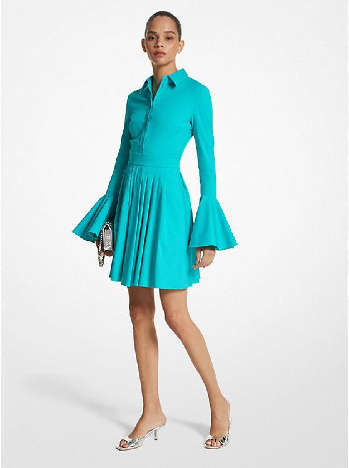 Elevating the daytime staple, this shirtdress is cut from organic stretch cotton poplin and features flared sleeves. A fitted bodice and gently pleated skirt add to its feminine allure. Style it with a metallic clutch and heels to take the look into evening.
