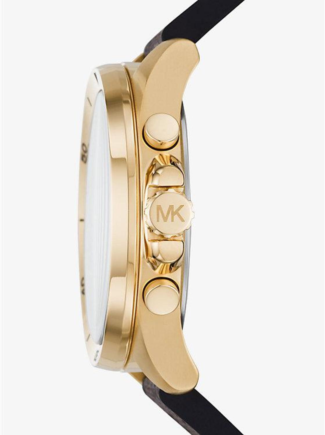 • Our Brecken watch combines a timeless silhouette with precision and style. Designed in gold-tone stainless steel with a logo strap for a signature finish, this oversized timepiece features a tachymeter scale and chronograph mechanism for measuring time over distance.