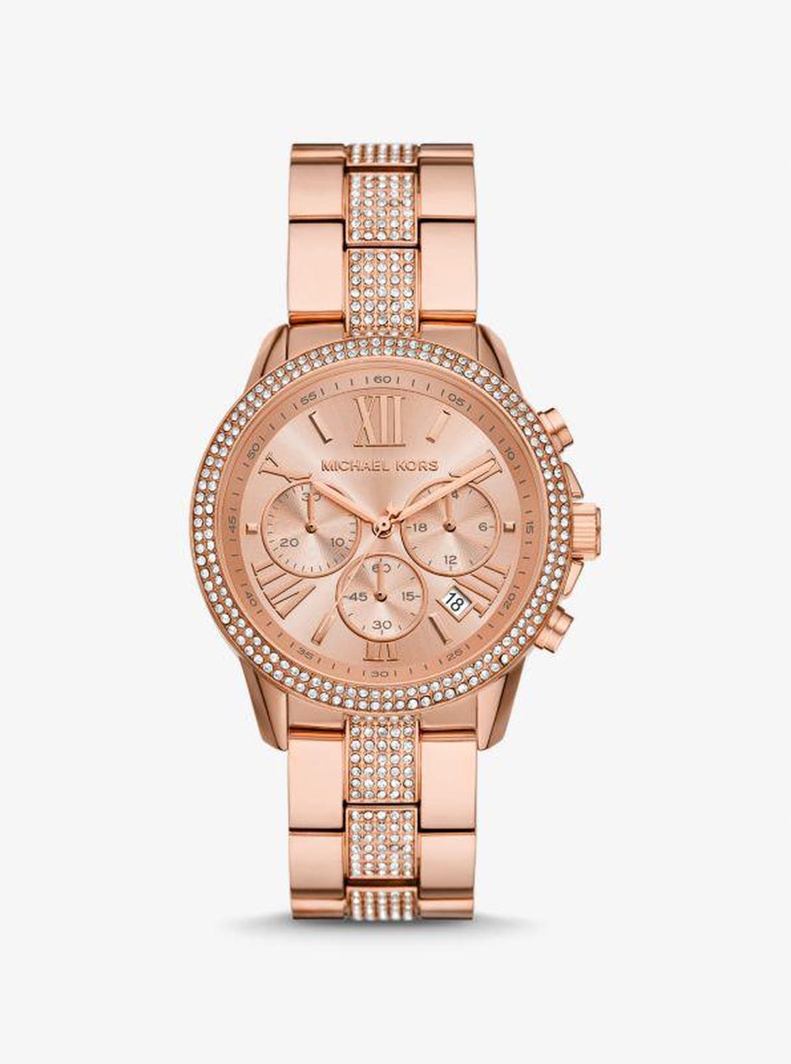 Crafted from rose gold-tone stainless steel and complete with shimmering pavé crystals at the bezel and center links, the Brynn watch exudes glamour. On the face, Roman numeral markers, a date window and chronograph details come together for fashion and function. Wear it whenever your outfit is in need of a little shine. • Oversized watch • Stainless steel • Rose gold-tone hardware • Pavé topring and centerlinks • Oversized • 40mm case • Quartz/3-hand movement • Clasp fastening • Water resistant up to 5 ATM • 2-year warranty • Imported • Oversized watch • Stainless steel • Rose gold-tone hardware • Pavé topring and centerlinks • Oversized • 40mm case • Quartz/3-hand movement • Clasp fastening • Water resistant up to 5 ATM • 2-year warranty • Imported