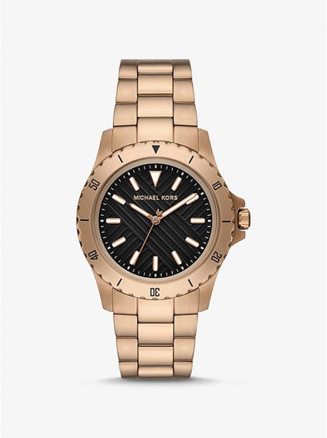 • The iconic Everest watch returns, updated with a textured noir dial. A beige gold-tone stainless steel case promises to stand up to endless wear and turns to reveal Michael’s signature, while chronograph details and a date window ensure precise timekeeping. Stack it on your wrist with an arm full of jewelry.