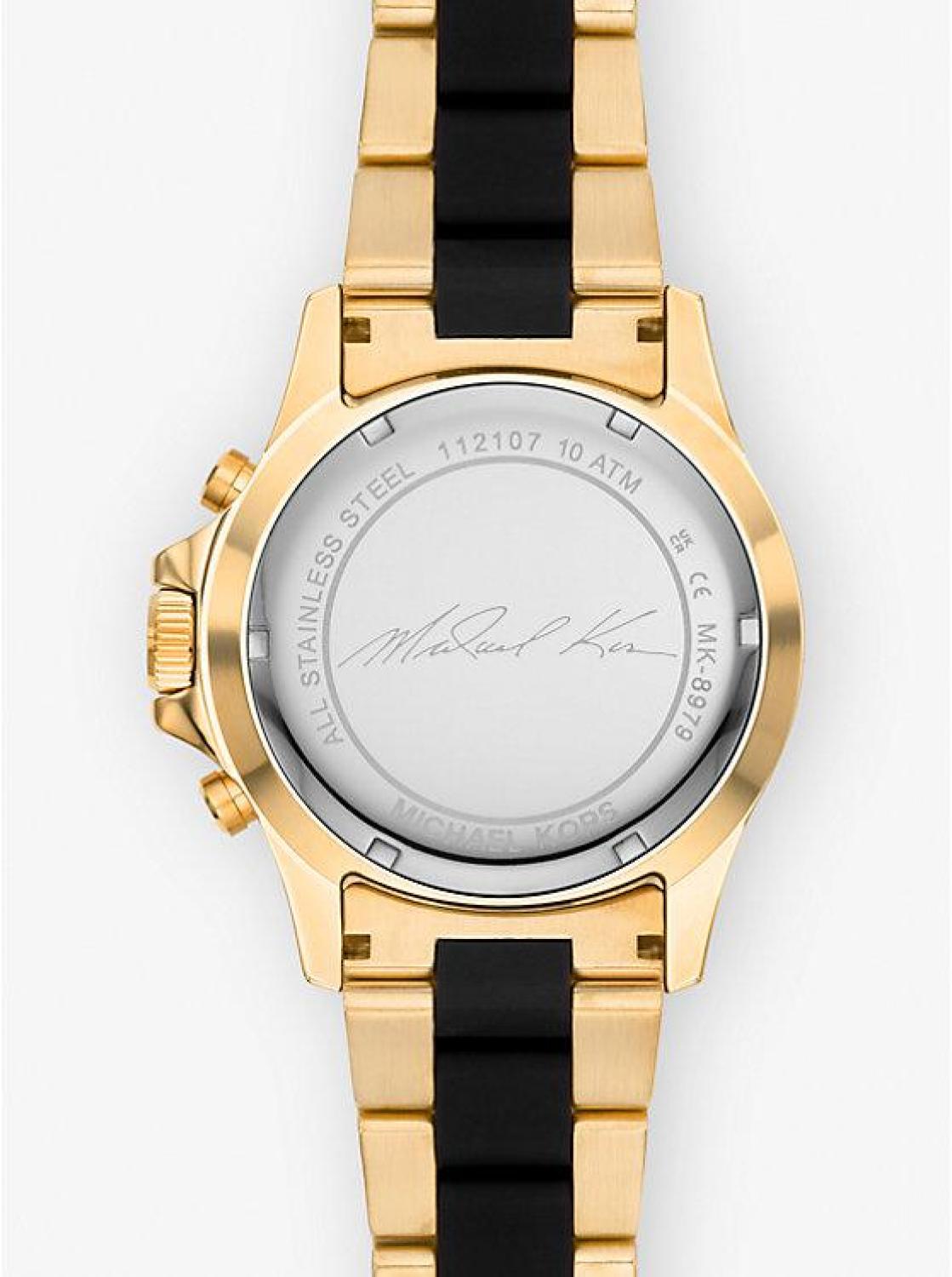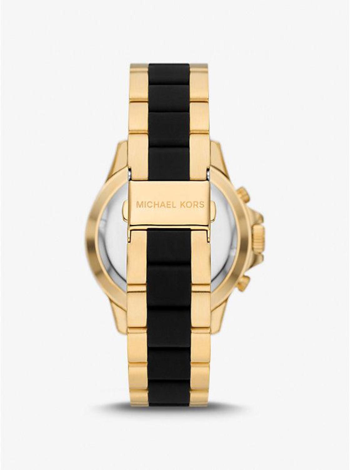 • The iconic Everest watch returns, updated with a two-tone bracelet strap. A gold-tone stainless steel case promises to stand up to endless wear and turns to reveal Michael’s signature, while the noir dial features chronograph details and a date window for added functionality.