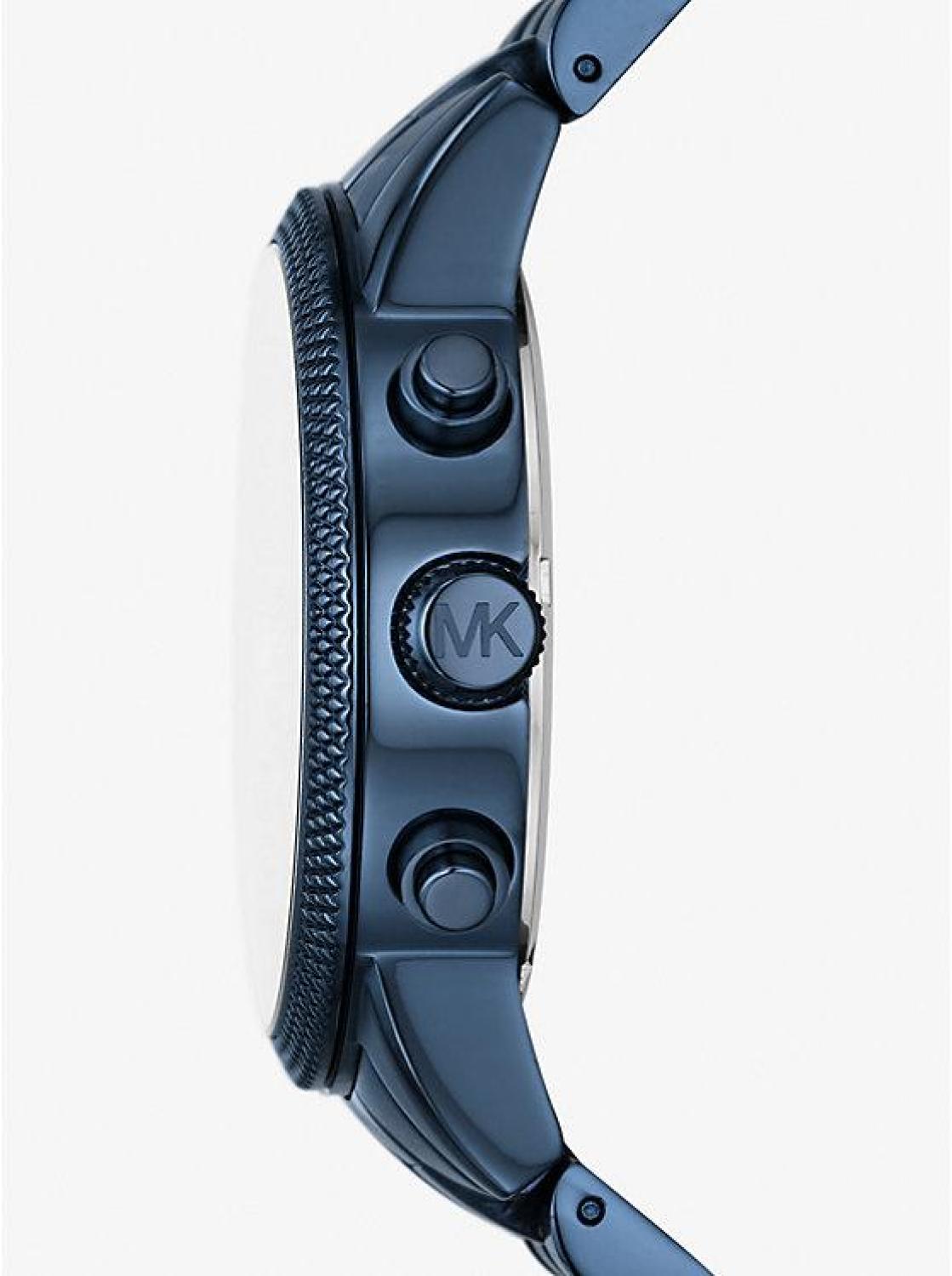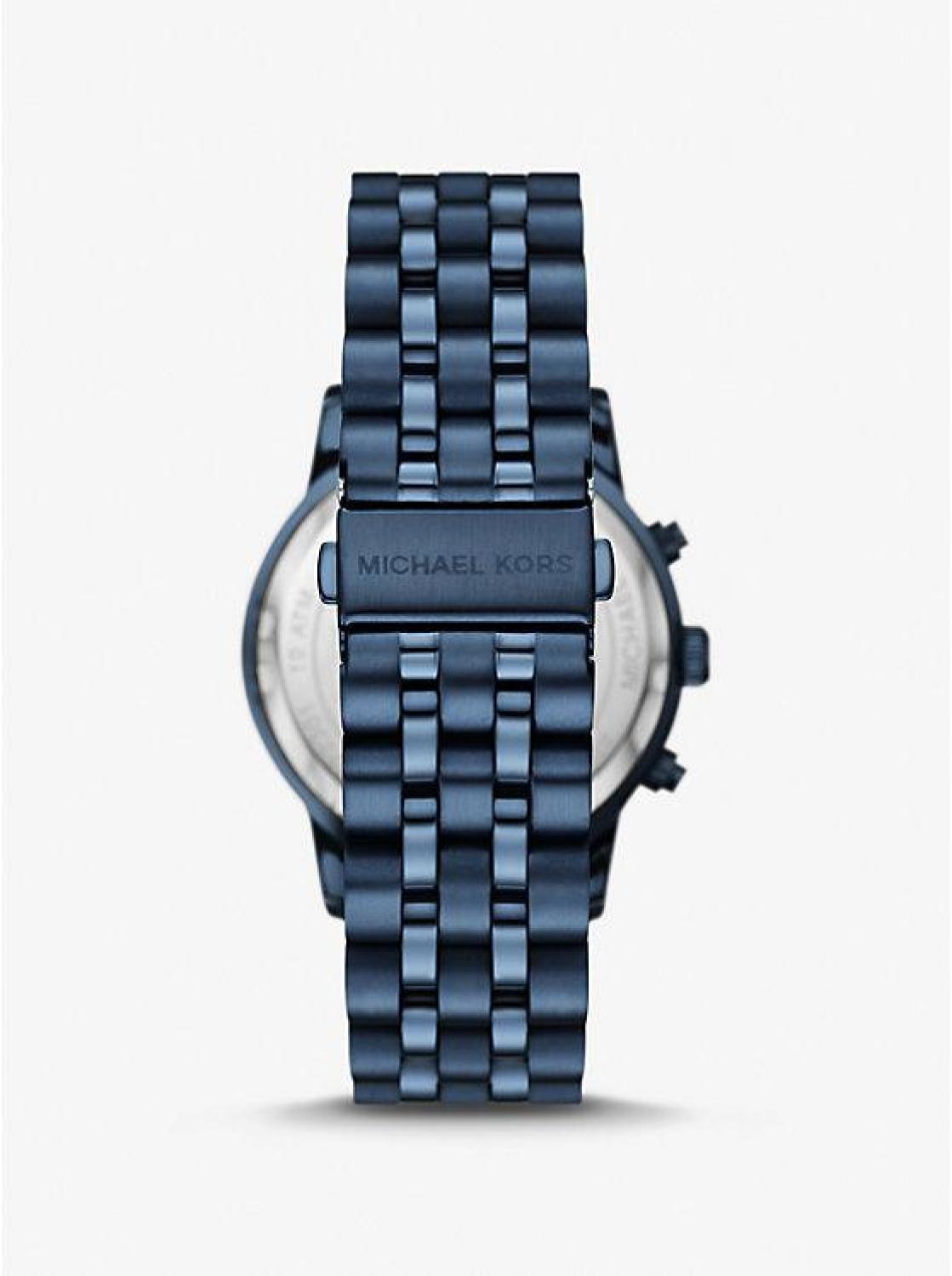 • Designed for those who appreciate the luxury of time, our Hutton is the statement watch to own. A chronograph display delivers precision timekeeping, while navy-tone stainless steel craftsmanship ensures it will stand up to endless wear. A textured topring and “MK” print dial lend a subtle yet sophisticated finish.