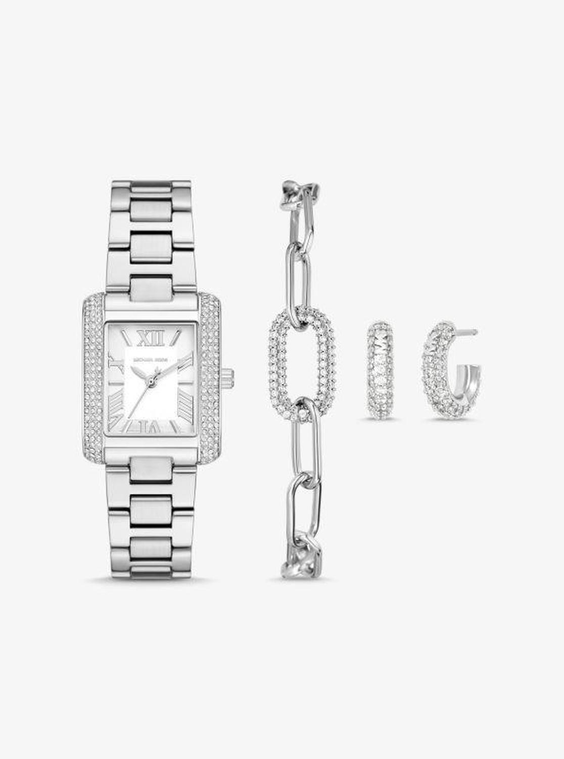 • This pavé-encrusted three-piece set includes our petite Emery watch as the centerpiece alongside a chain-link bracelet and hoop earrings. The gold-tone timepiece features a rectangular face, beveled strap and Roman numeral indexes for a classic finish. Worn together, thesepieces are simply dazzling.