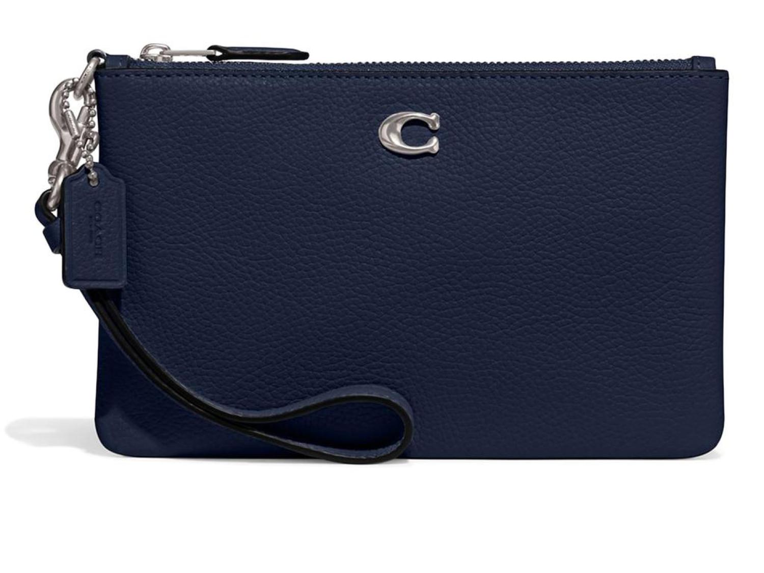 Crafted in polished pebble leather, this wristlet is perfectly sized for cards, cash and a phone. Wear it on your wrist or clip it inside a larger Coach bag.