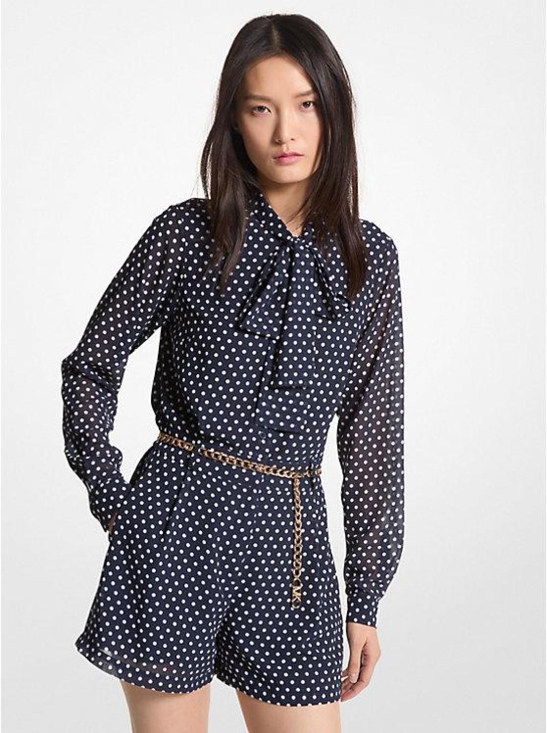 • This romper is cut in a tailored silhouette from georgette printed allover with polka dots. A logo-tipped chain link belt draws attention to the waist. Continue the polished vibe by styling yours with loafers.