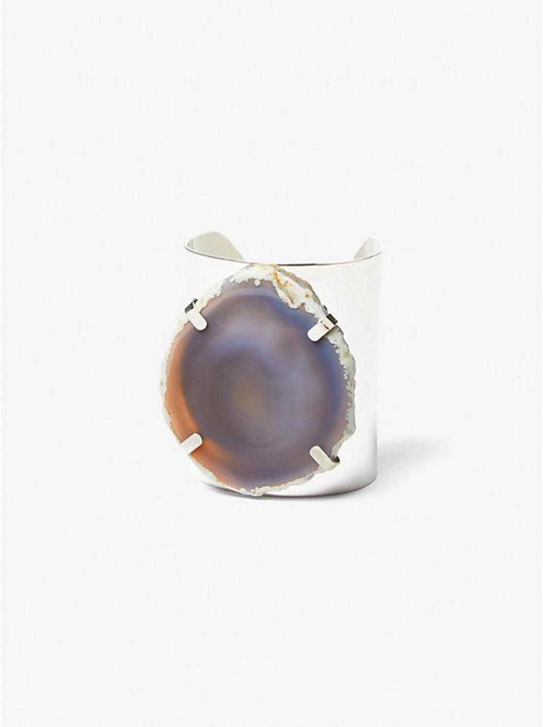 • Styled with multiple looks on the Fall/Winter 2023 runway, this striking cuff is plated in durable and high-shine platinum. It’s punctuated with a genuine agate stone that has a naturally marbled and faceted finish. Wear it alone, or with the matching collar necklace.