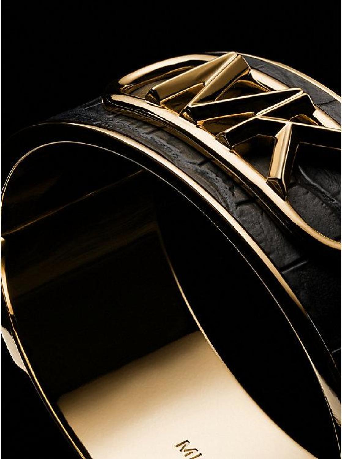 Our iconic Empire logo makes this 14K gold-plated bangle stand out. Featuring a crocodile-embossed band, this glamorous accessory is the perfect finishing touch to complete your next look. Pair it with complementing accessories or wear it alone. • Bangle • Brass/crocodile embossed polyurethane • 14K gold plating • 2.3”W X 2”H • Hinge fastening • Imported • Michael Kors jewelry is made of precious metals combined with various elements including semi-precious stones. Apply perfume and cosmetics prior to putting on your jewelry. To clean your jewelry, wipe with the soft buffing cloth provided. Keep your jewelry away from moisture as it promotes tarnish. We recommend storing your jewelry in a clean, dry place, such as the pouch that the product comes in. • Bangle • Brass/crocodile embossed polyurethane • 14K gold plating • 2.3”W X 2”H • Hinge fastening • Imported • Michael Kors jewelry is made of precious metals combined with various elements including semi-precious stones. Apply perfume and cosmetics prior to putting on your jewelry. To clean your jewelry, wipe with the soft buffing cloth provided. Keep your jewelry away from moisture as it promotes tarnish. We recommend storing your jewelry in a clean, dry place, such as the pouch that the product comes in.