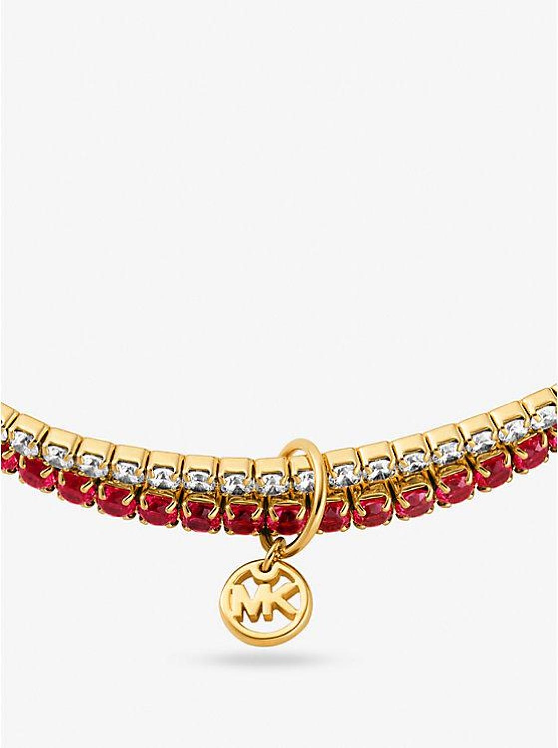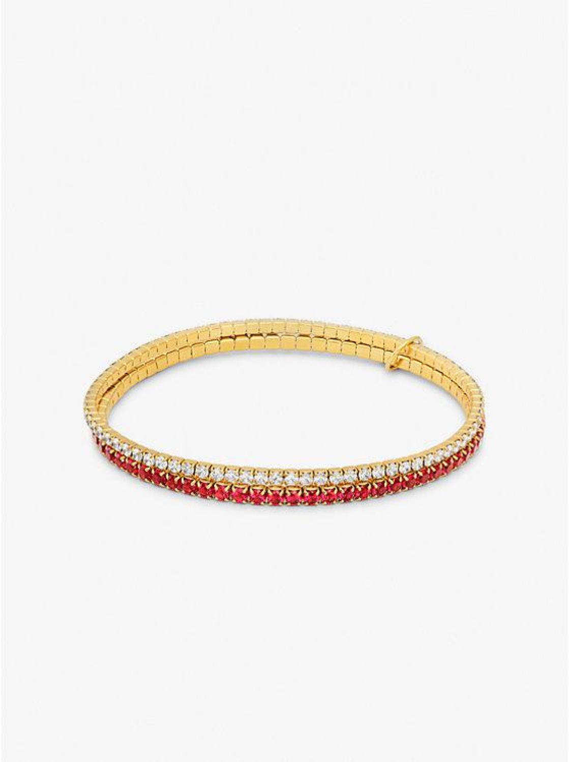 • Timeless with a touch of the contemporary, this metal-plated brass tennis bracelet is strung with two strands set with a dazzling array of two-tone colored cubic zirconia. Elastic cords allow you to slip it on and off with ease. Layer yours over the cuff of your favorite shirt.