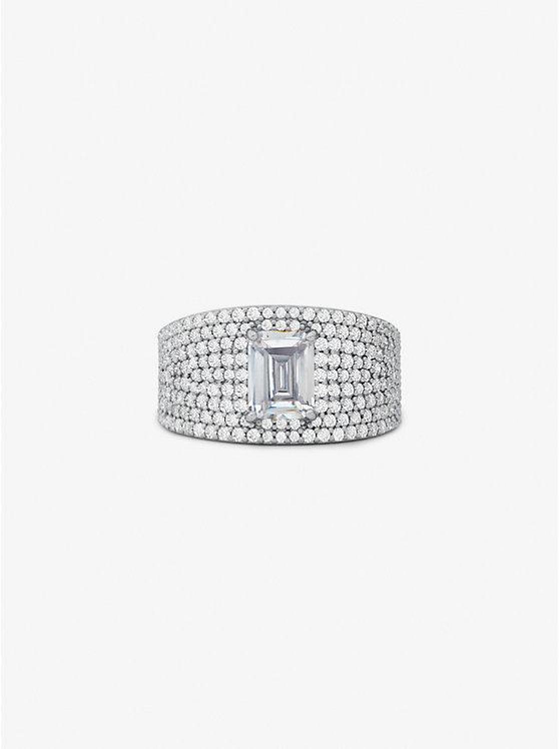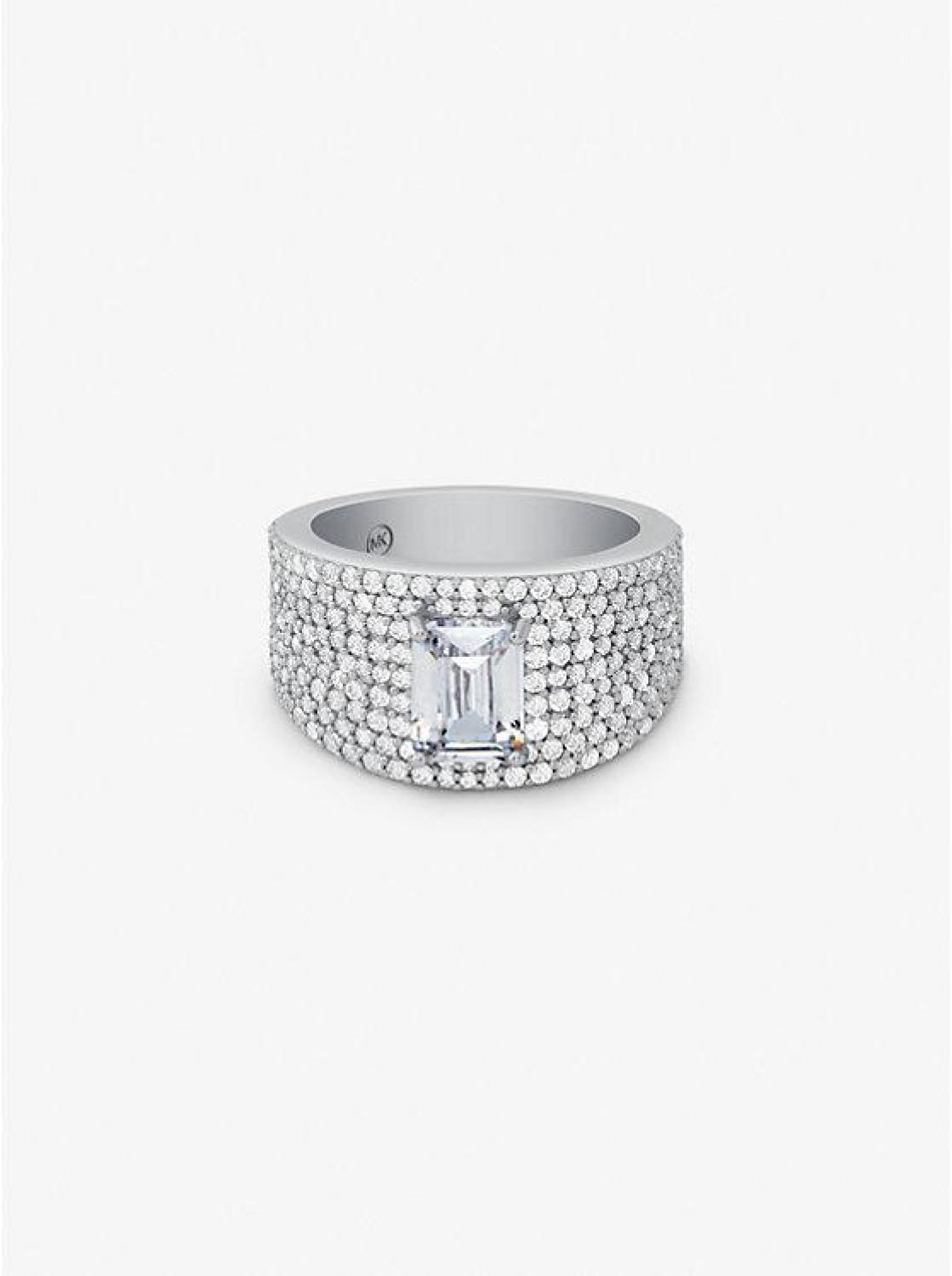 • A dazzling addition to your jewelry box, this rhodium-plated sterling silver ring features a cubic zirconia center surrounded by shiny pavé accents for extra shimmer. Stack it with complementary accessories for a bold finish or wear it solo for a more subtle feel.