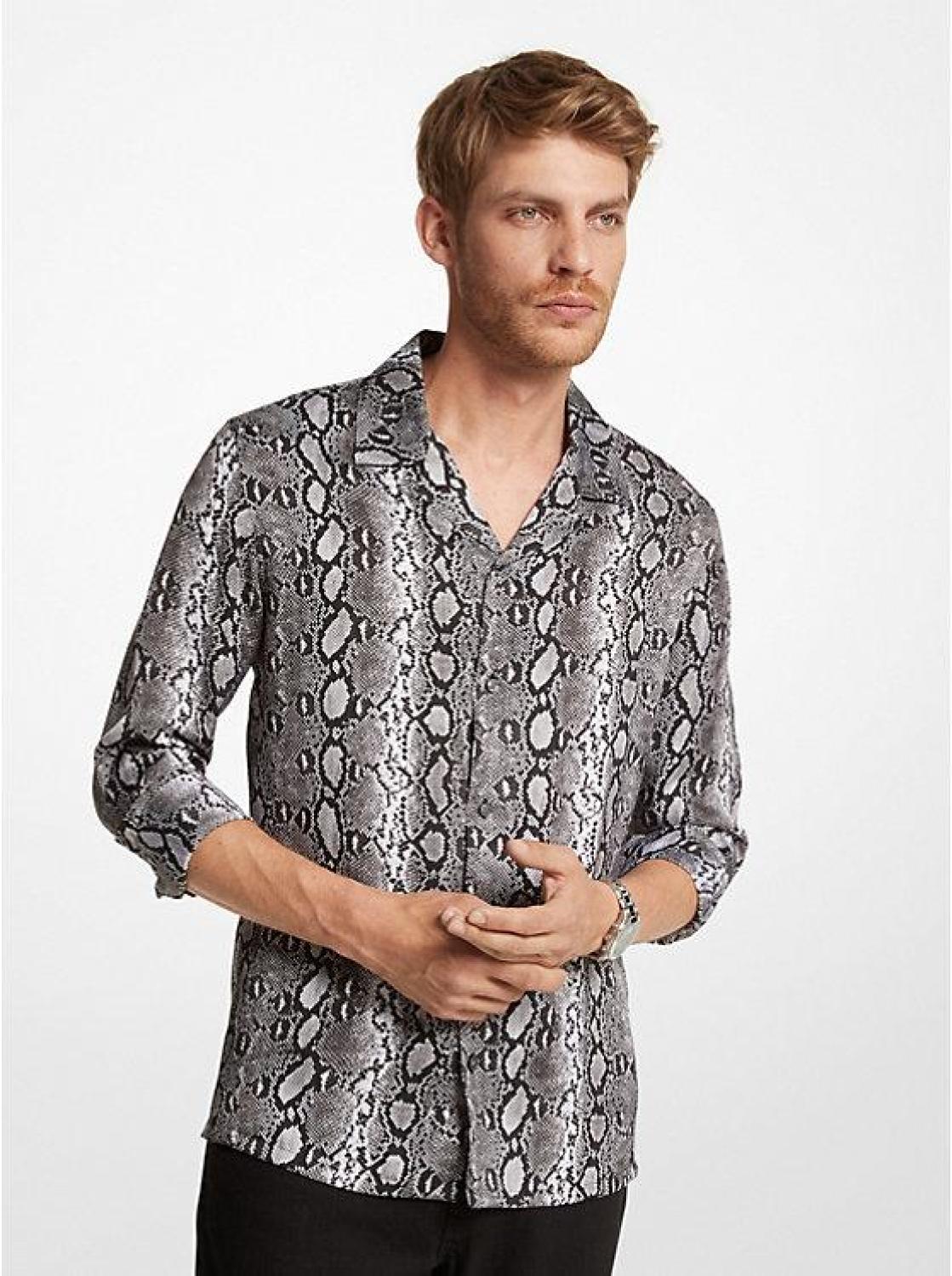 • Python print infuses this otherwise classic button-up with a rock 'n' roll sensibility. Complete with a camp collar and subtle buttons up the front that blend in with the pattern, it’s a statement-making style that’s perfect with black denim for a night out.