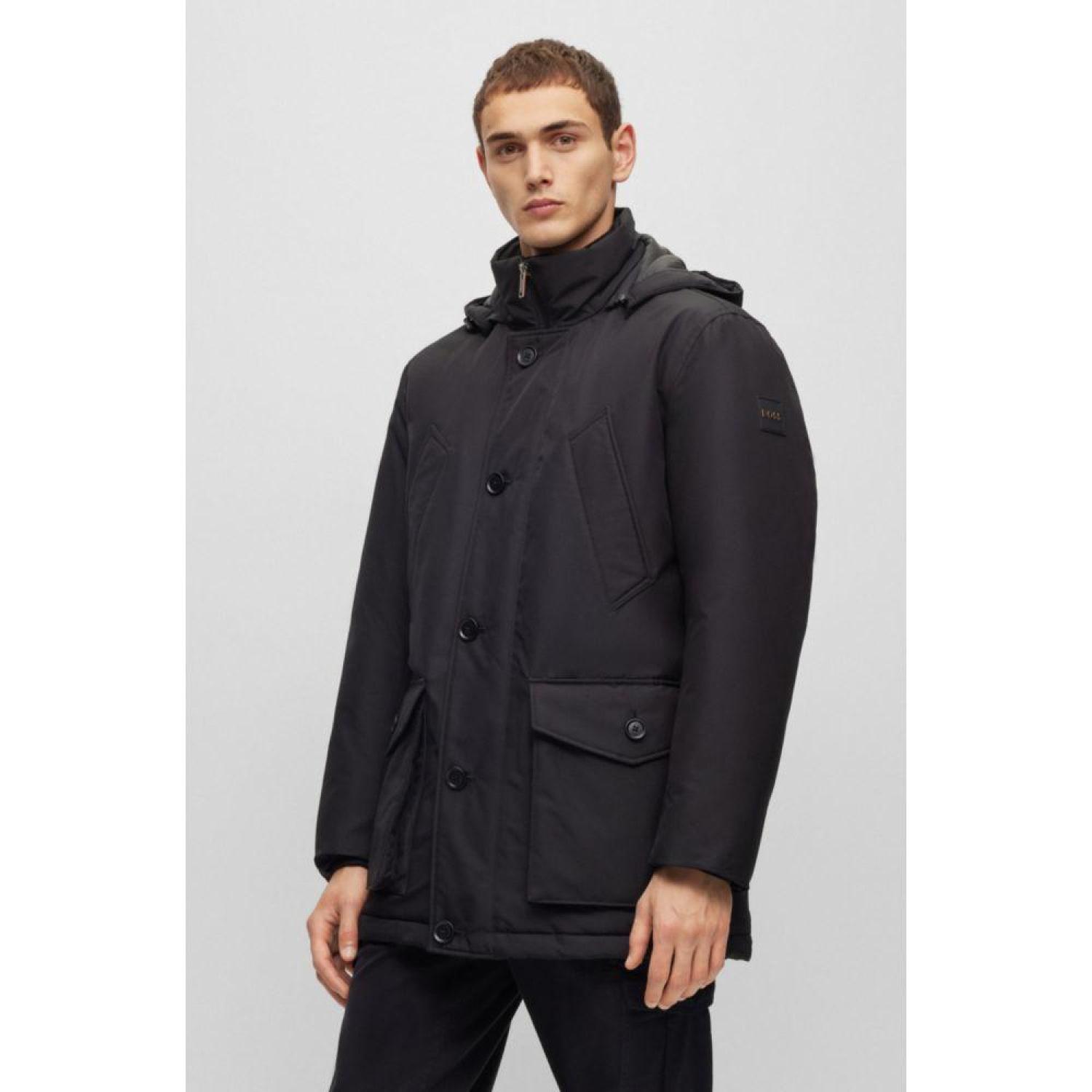• A hooded parka cut to a relaxed fit in water-repellent micro-textured material with logo trims and cozy pockets by BOSS Menswear.