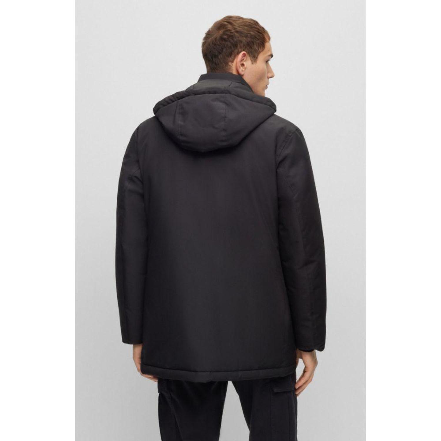 A hooded parka cut to a relaxed fit in water-repellent micro-textured material with logo trims and cozy pockets by BOSS Menswear.