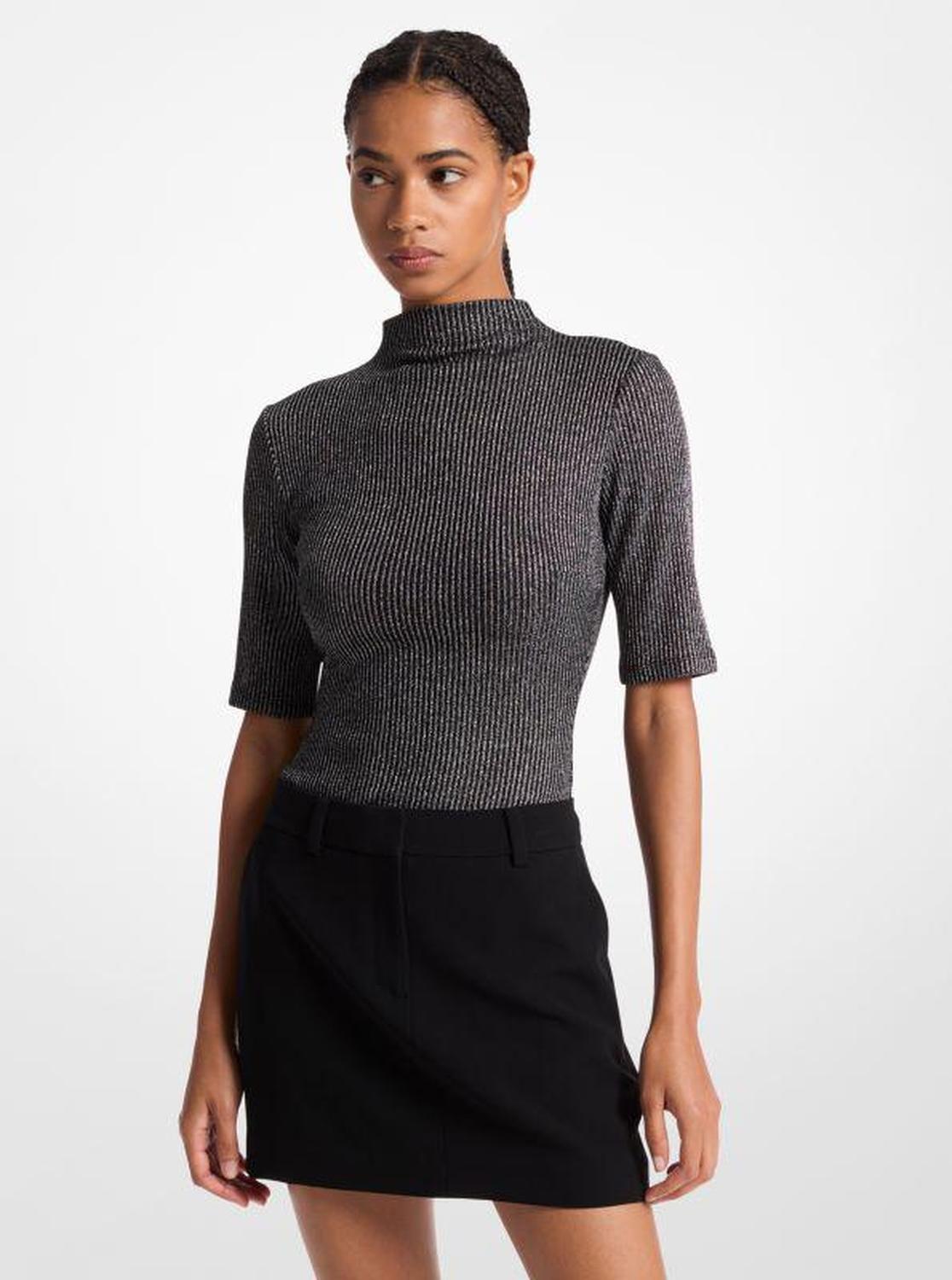 • At the top of our list of wardrobe essentials: a knit layer in an of-the-moment silhouette. Cut from a ribbed stretch knit, the close-fitting top features a funnel neck and three-quarter sleeves for just the right amount of coverage. Wear it as a base layer under your favorite blazer or jacket.