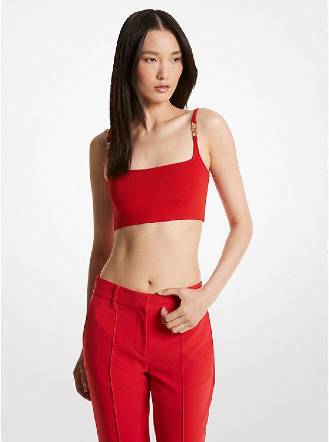 • This ultra-cropped tank top is a chic complement to the season’s high-rise pants. Complete with logo straps, it’s cut from a body-hugging stretch knit that puts the focus on your figure. The coolest way to wear it? With structured trousers in the same vibrant hue.
