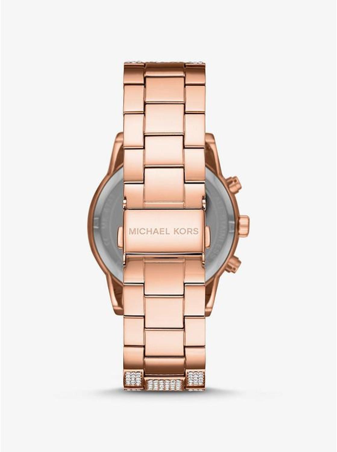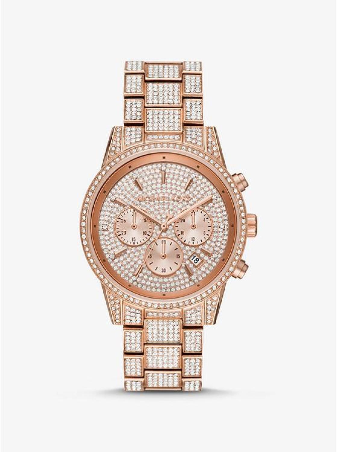 • Radiant and refined, the Ritz watch combines rose gold-tone stainless steel with a menswear-inspired bracelet strap for a chic and timeless finish. The chronograph display lends functionality, while allover pavé embellishments deliver maximum shine.