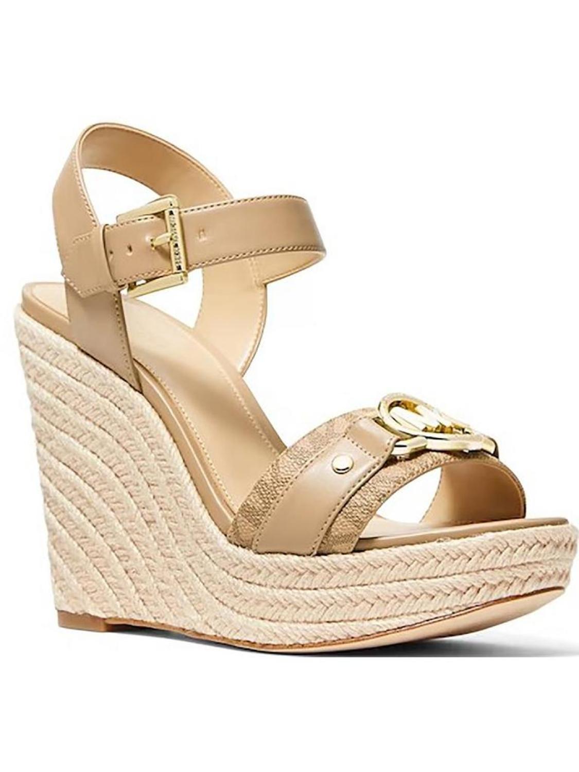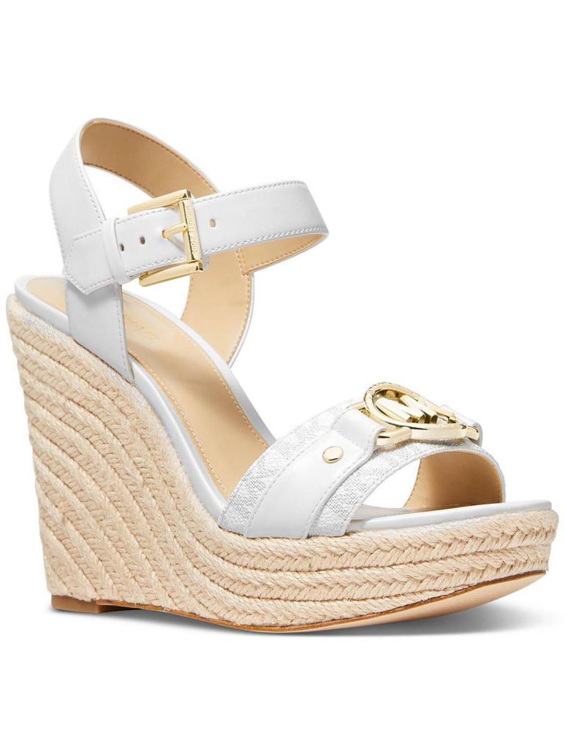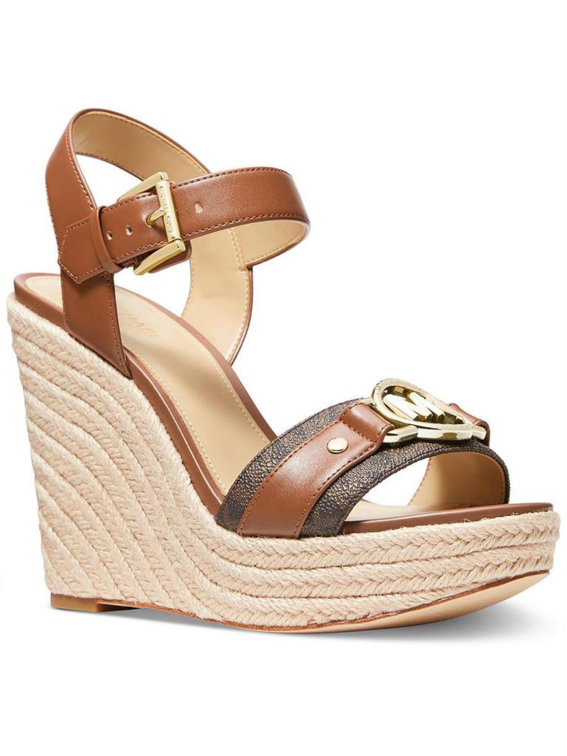 Manufacturer - MICHAEL Michael Kors Size Origin - US Retail - $115.00 Style Type - Wedge Sandals Collection - MICHAEL Michael Kors Closure - Material - Manmade Fabric Type - Faux Leather P2747695*True to size* Step out in style this season with the Rory by MICHAEL Michael Kors. Crafted from fine faux leather uppers & man-made lining, with an eye-catching gold-tone logo embellishment detail. Featuring an adjustable buckle on slingback strap with durable rubber outsoles. 4.5" heel & 1.5" platform Style - 40R3ROHS2LThe item for sale is pictured above and described on this page. The photo may include additional clothing or props that are for display purpose only and will not be included. Please be sure to read the description carefully.
