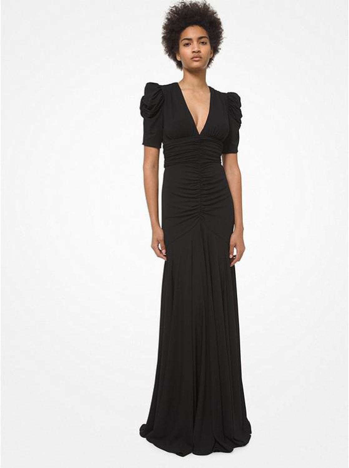 • Effortless yet luxurious. Crafted in Italy from stretch matte jersey, this V-neck gown is designed to make a statement with lightly puffed sleeves and ruching that accentuates the frame. Balance the floor-sweeping hem with towering platforms in a complementary hue.