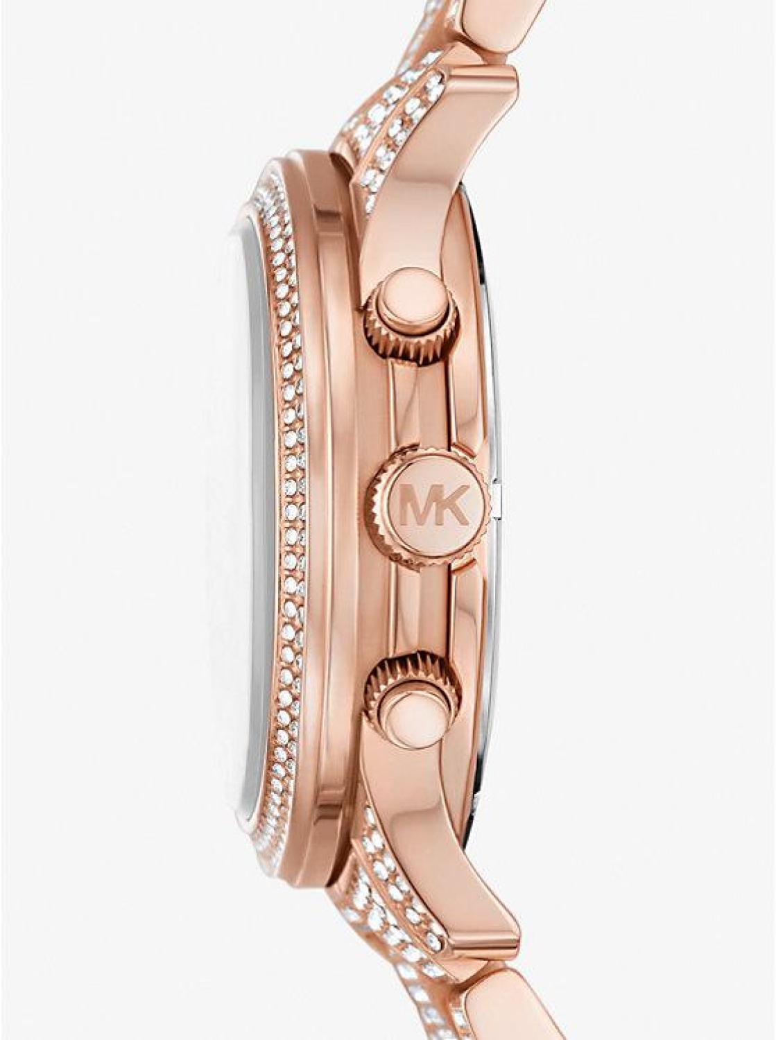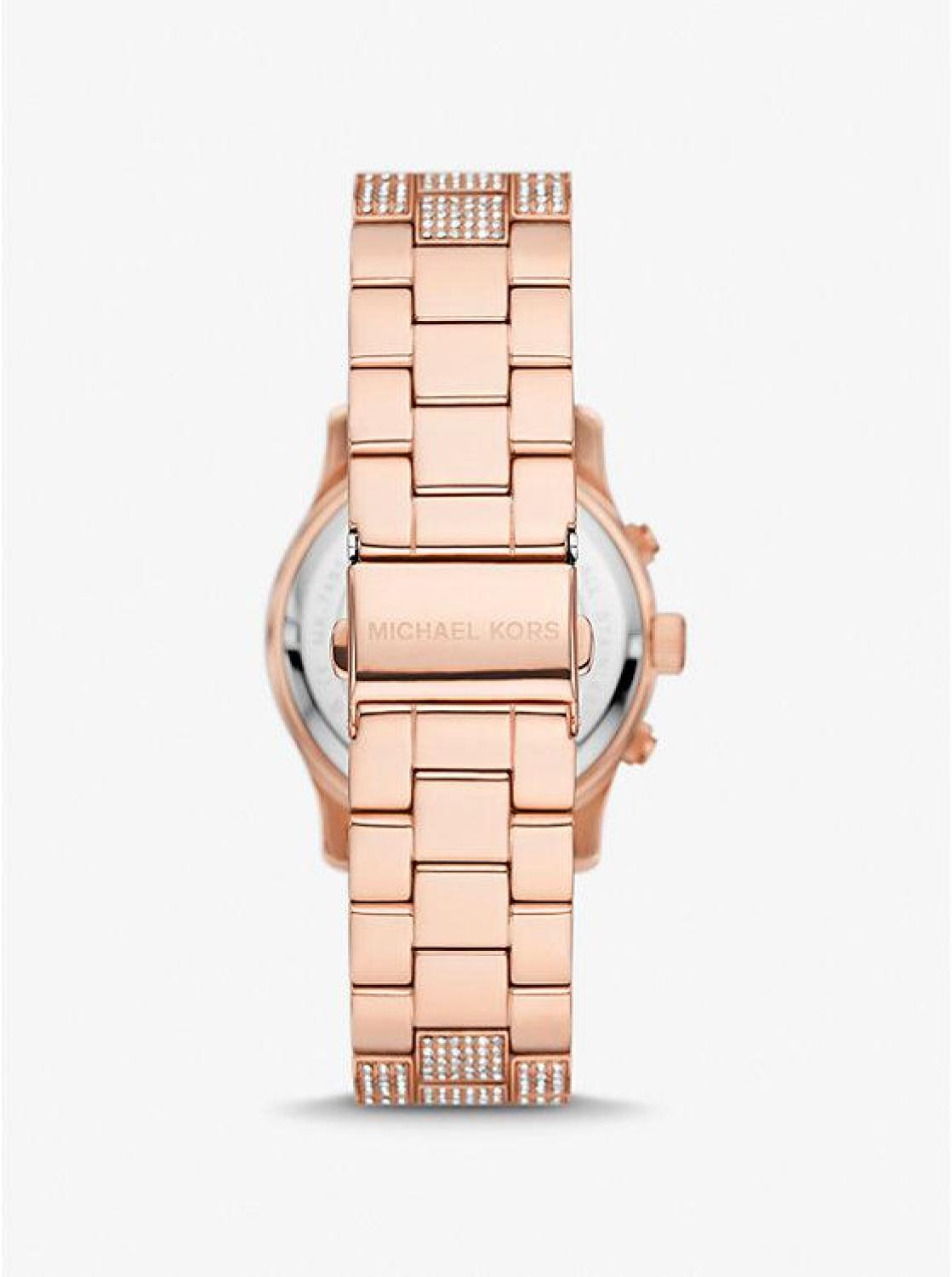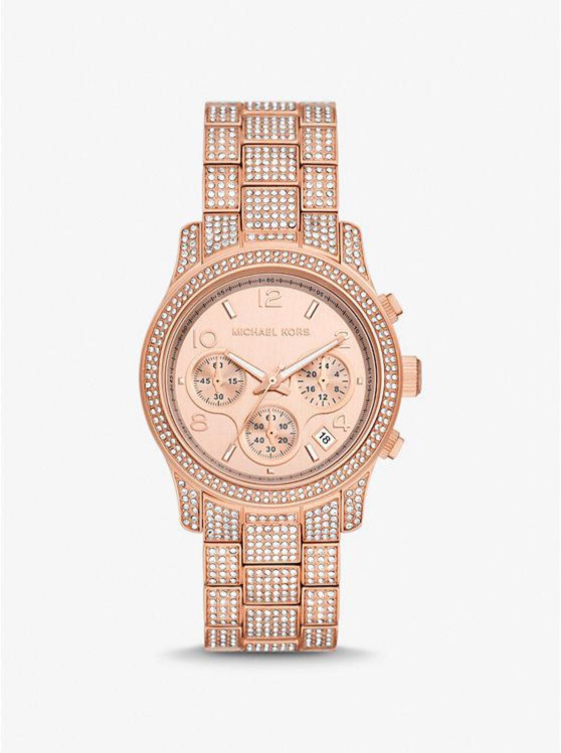 • Instantly eye-catching, our new Runway watch is defined by a shimmering pavé-encrusted bezel and bracelet strap. Updated with raised sub dials, this dazzling style is crafted from rose gold-tone stainless steel and features chronograph details for precise timekeeping. Wear it alone, or stacked with complementing jewelry to dial up the drama.