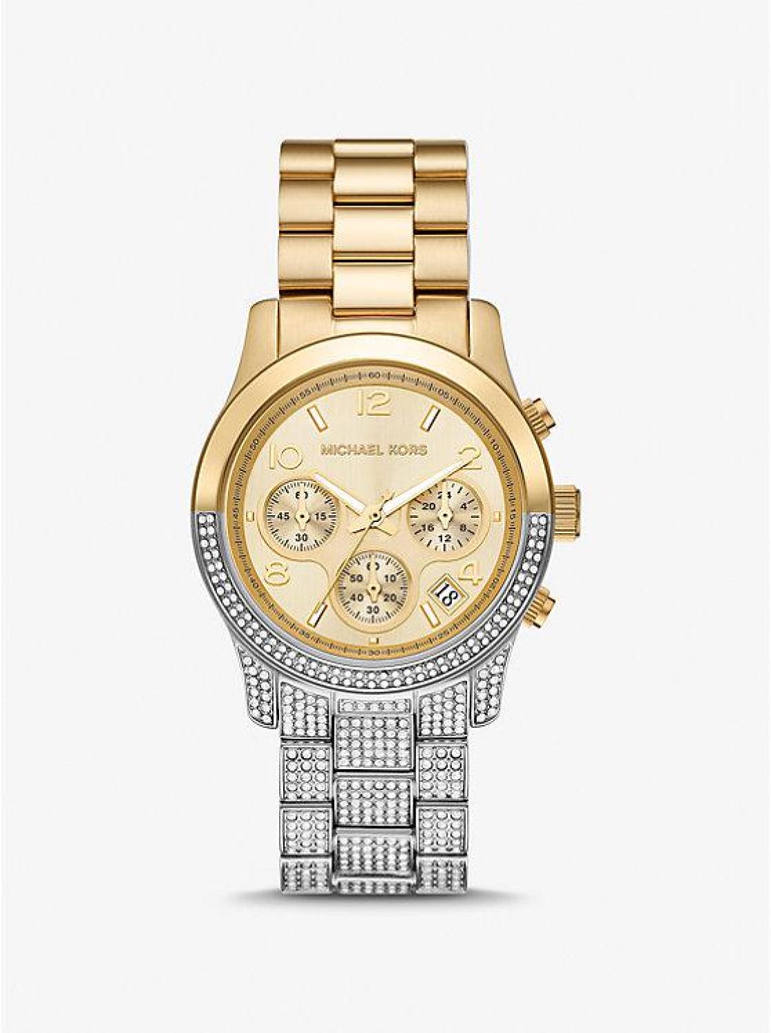 • Dial up the shine with this glamorous take on our Runway watch, which looks like it’s been dipped in sparkle. Crafted from stainless steel, this two-tone timepiece is partially traced with diamonds that match those on the topring and bracelet strap. The gold-tone dial features a date window and chronograph sub dials powered by a quartz movement.