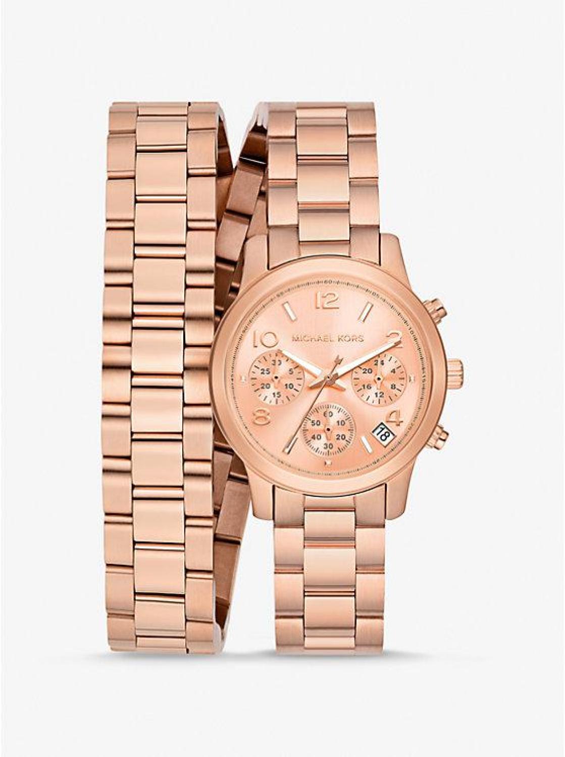 A decadent timepiece with everlasting style, the newest addition to our beloved Runway watch series is designed with a polished link bracelet that wraps around the wrist for a luxe finish. Updated with raised sub dials, this glamourous style is crafted from rose gold-tone stainless steel and features chronograph details for precise timekeeping.