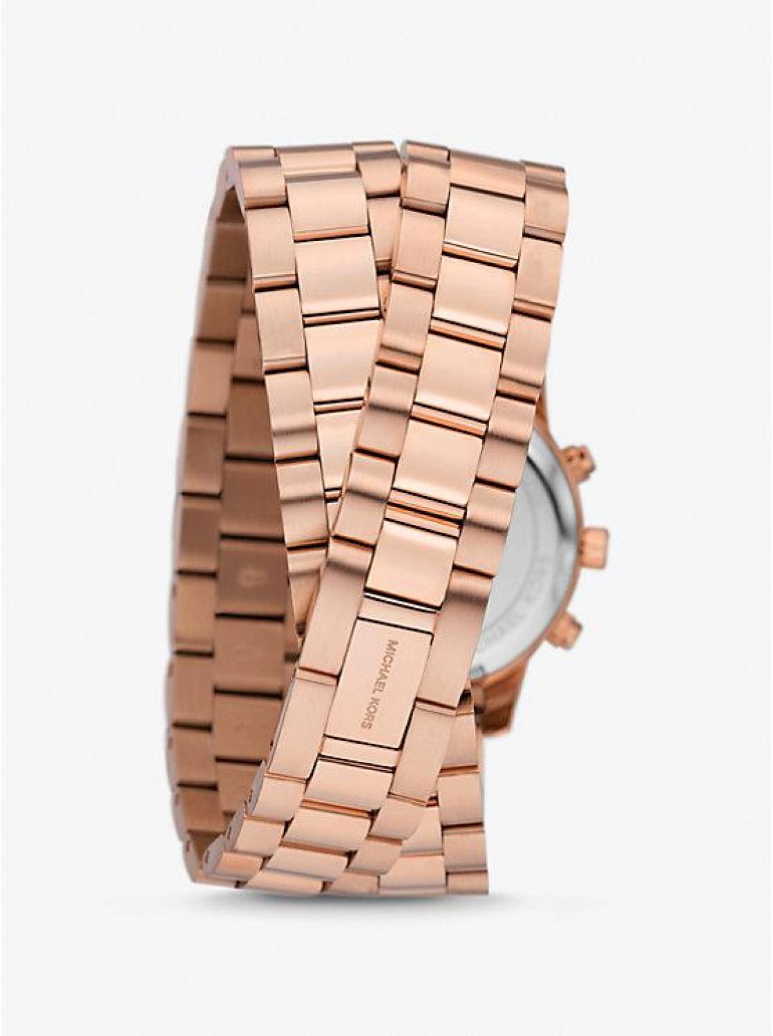• A decadent timepiece with everlasting style, the newest addition to our beloved Runway watch series is designed with a polished link bracelet that wraps around the wrist for a luxe finish. Updated with raised sub dials, this glamourous style is crafted from rose gold-tone stainless steel and features chronograph details for precise timekeeping.