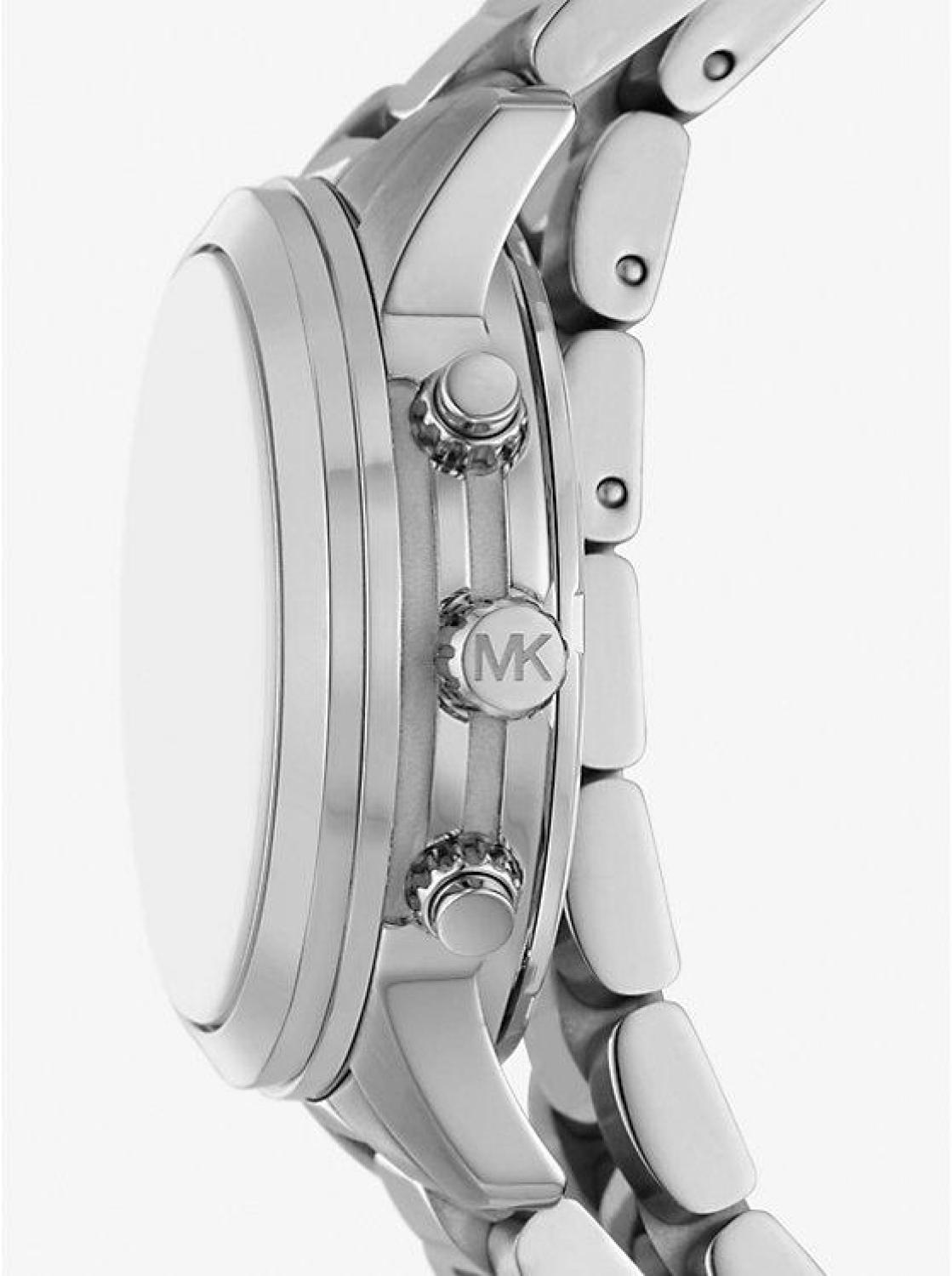 A decadent timepiece with everlasting style, the newest addition to our beloved Runway watch series is designed with a polished link bracelet that wraps around the wrist for a luxe finish. Updated with raised sub dials, this glamourous style is crafted from silver-tone stainless steel and features chronograph details for precise timekeeping. • Mid-sized watch • Stainless steel • Silver-tone hardware • Mid-sized • 34mm case • Quartz/chronographic movement • Clasp fastening • Water resistant up to 5 ATM • 2-year warranty • Imported • Mid-sized watch • Stainless steel • Silver-tone hardware • Mid-sized • 34mm case • Quartz/chronographic movement • Clasp fastening • Water resistant up to 5 ATM • 2-year warranty • Imported