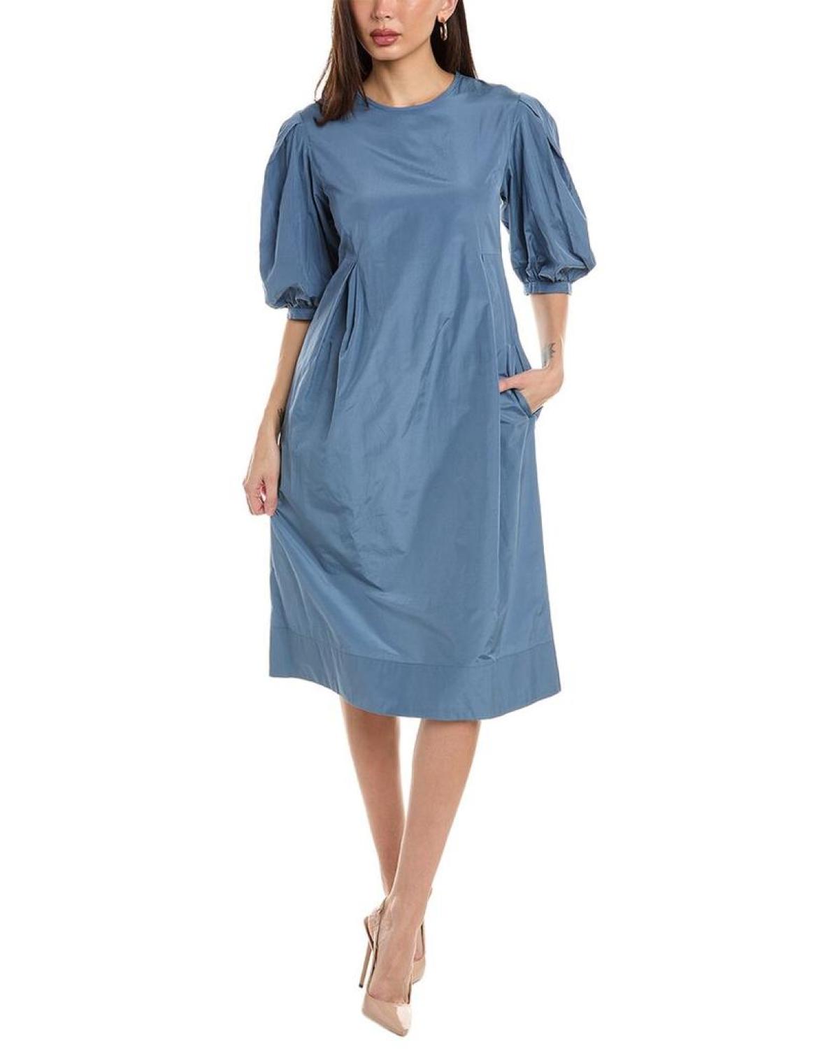 Introducing the S Max Mara Liuti Midi Dress, a stunning addition to your wardrobe. This beautiful dress features pleated balloon sleeves, a pleated skirt, and convenient side seam pockets. The rich blue color/pattern adds a pop of color to your ensemble, while the center back zipper allows for easy on and off. Made from a luxurious blend of 60% polyester and 40% cotton, this dress is both comfortable and stylish. Perfect for a variety of occasions, from brunch to date night. Dry clean only. Imported. Model is 5'9' and is wearing a size 2. Measurements may vary slightly by size.