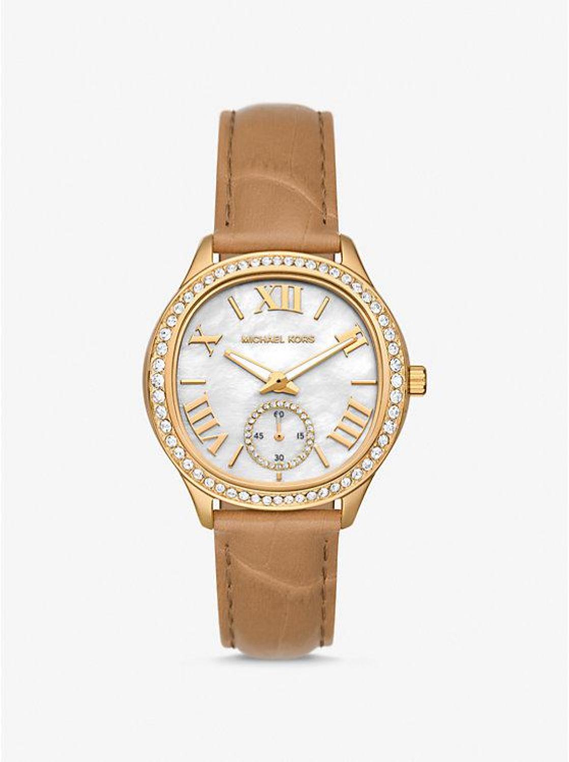 Designed with an iridescent mother-of-pearl face illuminated by glittering pavé accents, this shrunken-down version of our coveted Sage watch is timeless. With a croc-embossed strap, it features Roman numeral indexes for precise timekeeping and a dainty gold-tone casebody that makes it easy to stack with complementing bracelets.