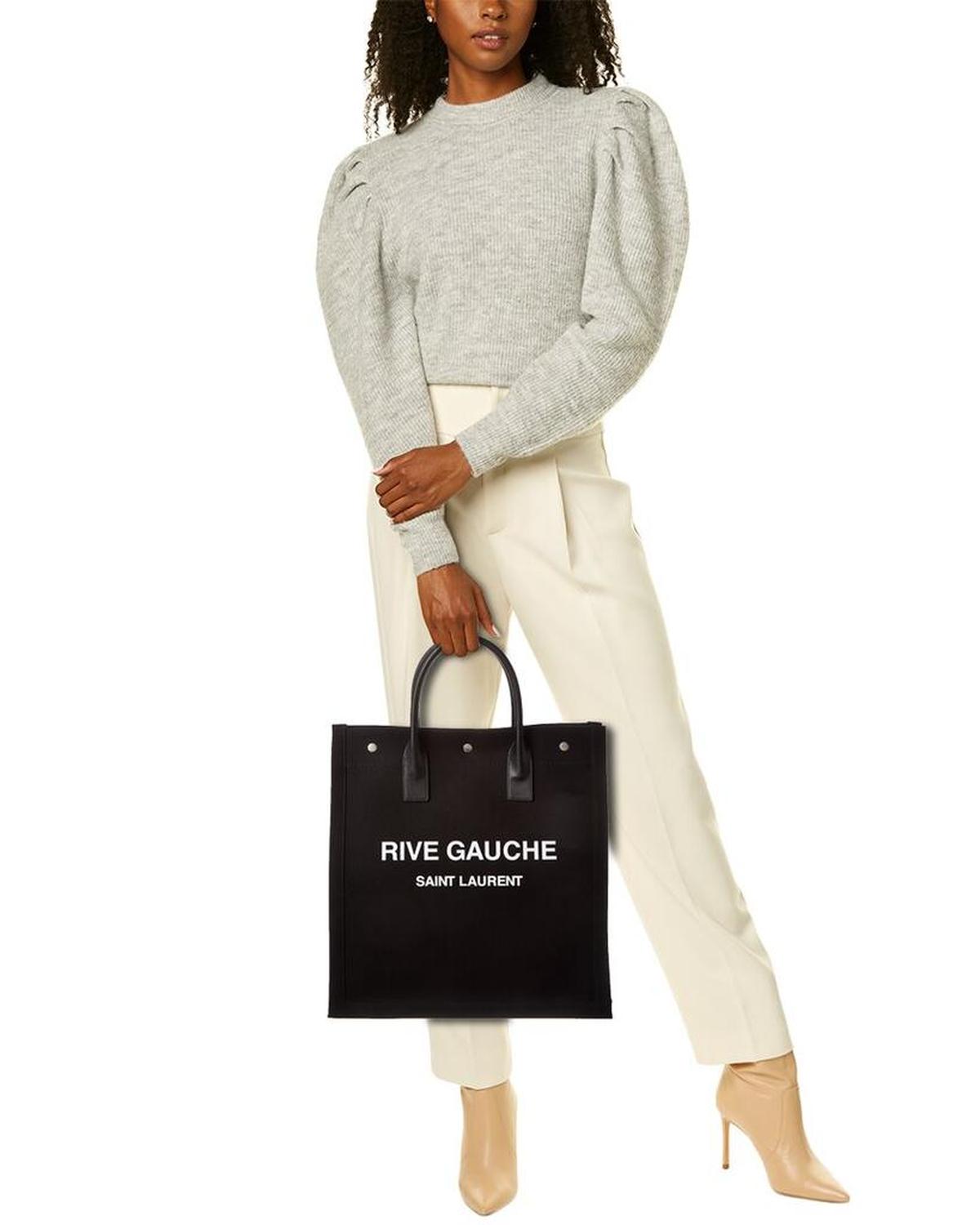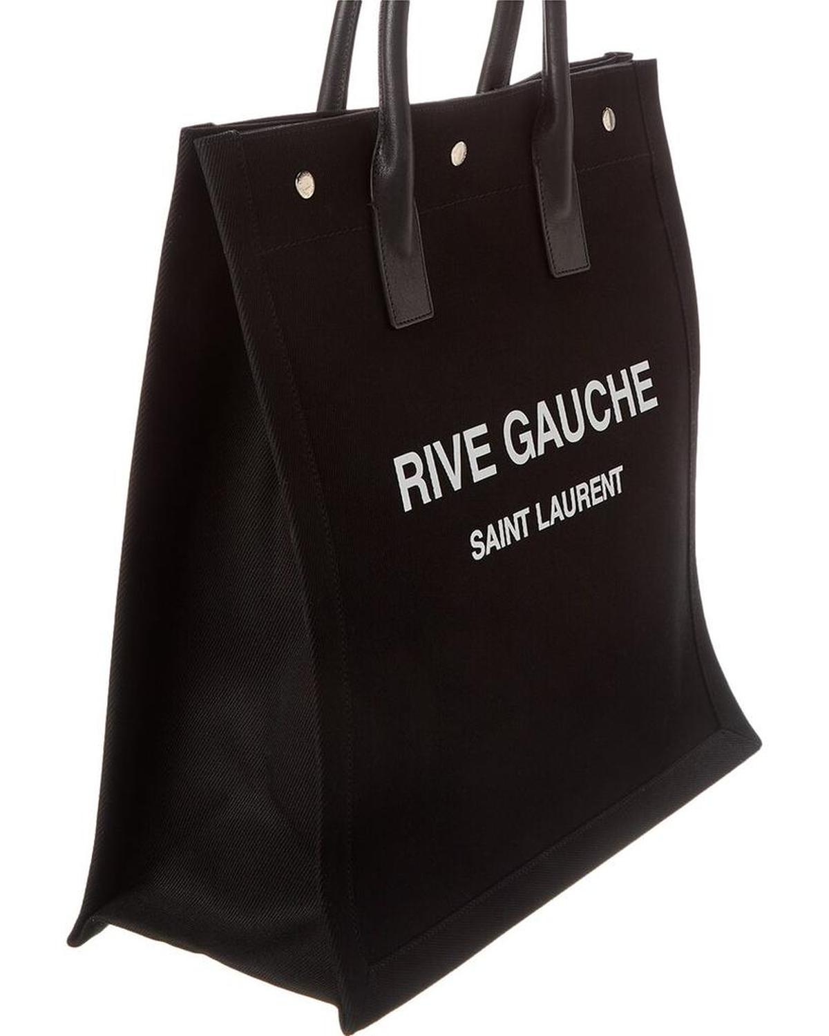 Elevate your everyday look with the iconic and modern glam of Saint Laurent with the Rive Gauche N/S Canvas & Leather Tote. This stylish tote is made in Italy and features a black canvas and leather construction with silver-tone hardware. The interior is lined with fabric and includes a convenient interior pocket. Measuring 14.5 inches wide, 15.3 inches high, and 5 inches deep, this tote also has top handles with a 5-inch drop. The open top snap closure ensures your belongings stay secure while on the go. Please note that all measurements are approximate and slight variations may occur. Rest assured, this product is 100% genuine, sourced from trusted independent suppliers. Add a touch of chic to your wardrobe with this luxe tote from Saint Laurent.