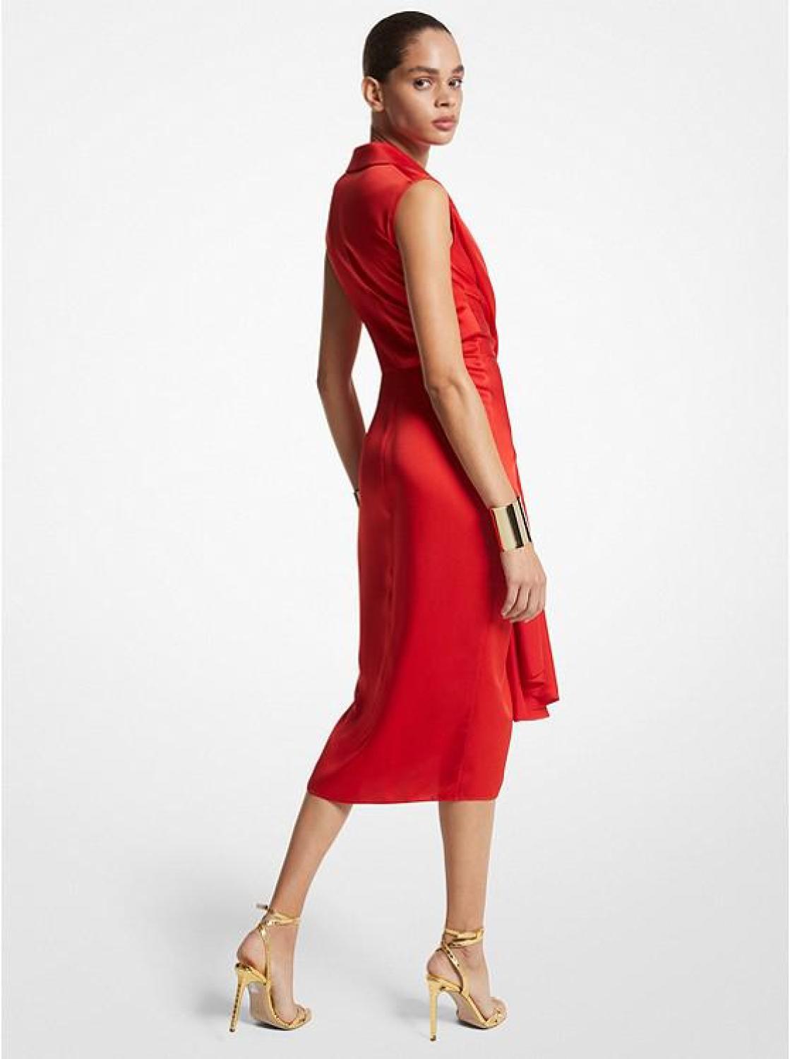 Paint the town red in this poppy-hued shirtdress. A twisted detail at the front cascades into a ruffle and creates a ruched effect at the bodice. We love it with a matching miniaudiére and metallic stilettos.