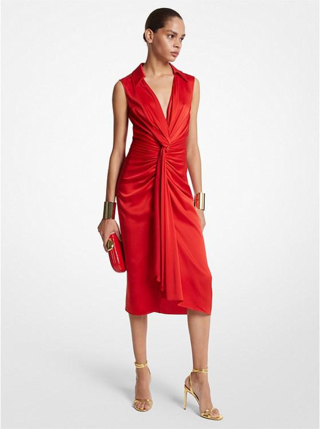 • Paint the town red in this poppy-hued shirtdress. A twisted detail at the front cascades into a ruffle and creates a ruched effect at the bodice. We love it with a matching miniaudiére and metallic stilettos.