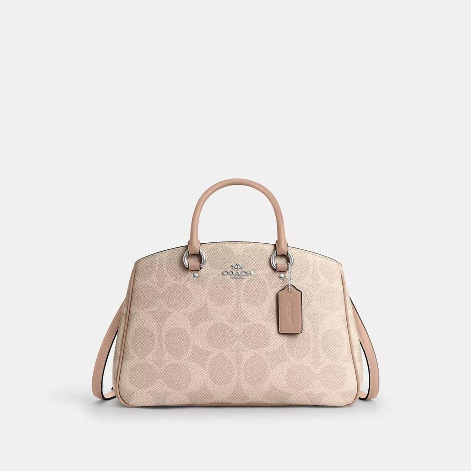 Signature coated canvas Inside multifunction pocket Center zip compartment Magnetic snap closure fabric lining Handles with 4 drop Detachable strap with 21 3/4 drop for shoulder or crossbody wear Four protective feet at base 14 (L) x 8 3/4 (H) x 5 (W) Style No. CAL55 | Coach Outlet Savannah Carryall Bag In Signature Canvas - Beige