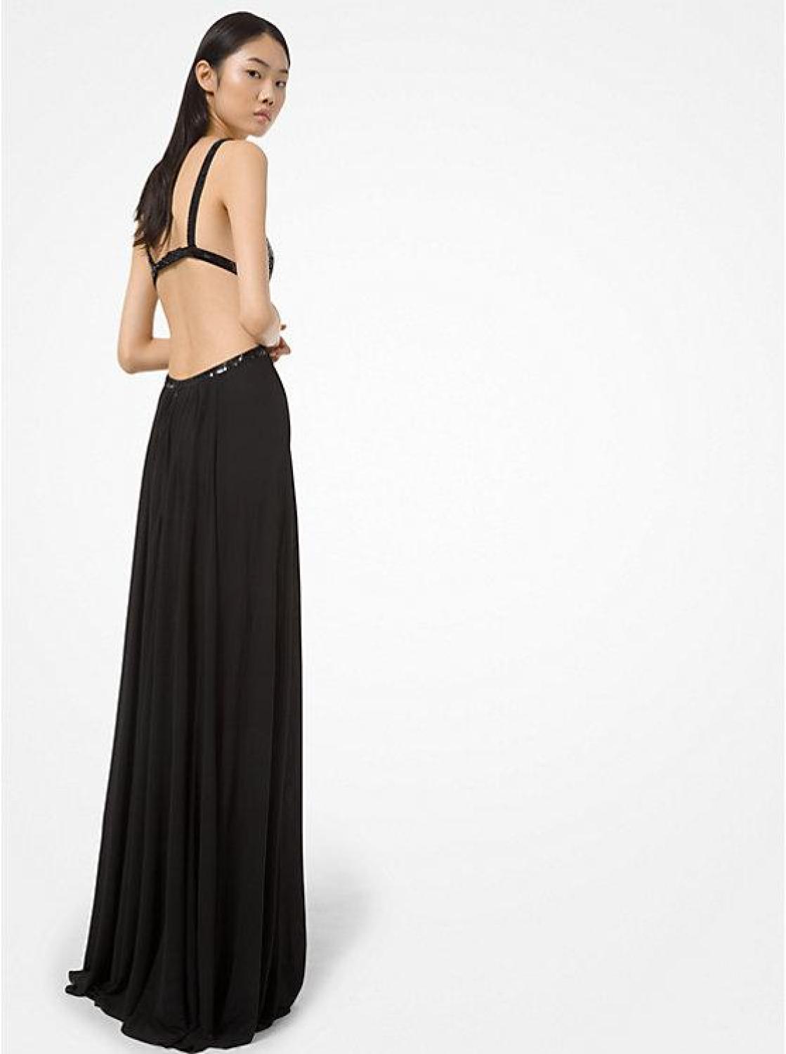 • “This bikini gown captures an effortless, barefoot sort of glamour,” says Michael. An ethereal choice for evening, this Italian-crafted piece features an alluring hand-embroidered bodice and bold cutouts. It cascades to a softly pleated skirt rendered in smooth jersey that instantly flatters the silhouette. Complement this head-turning style with noir accessories.