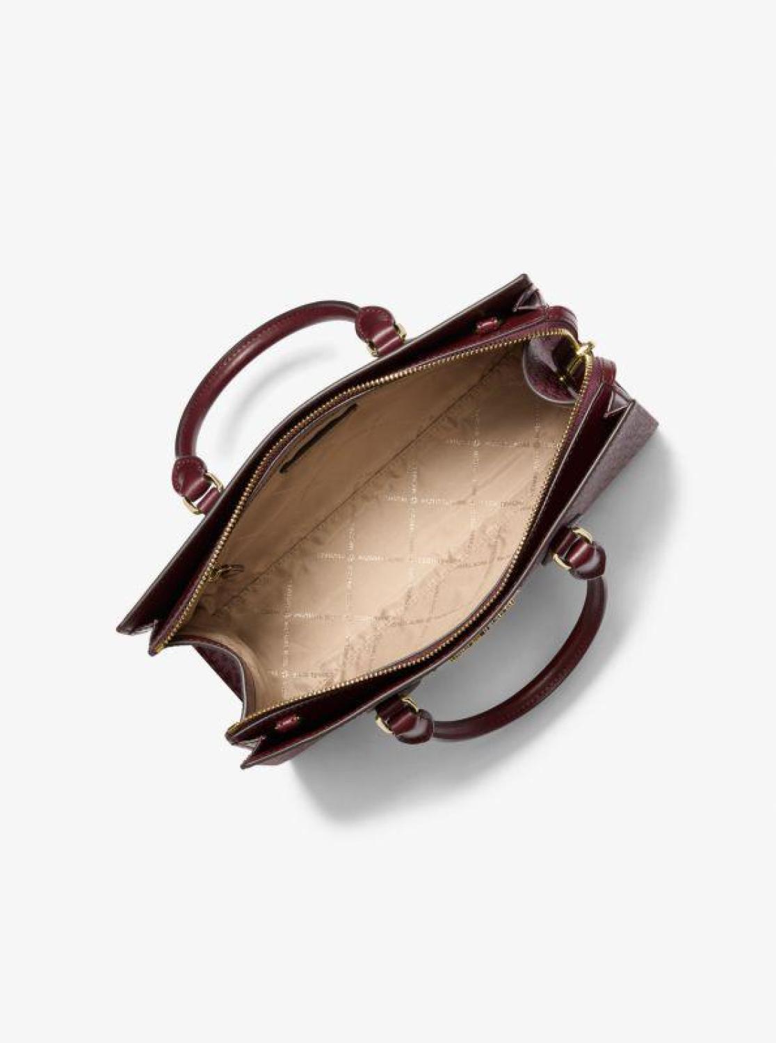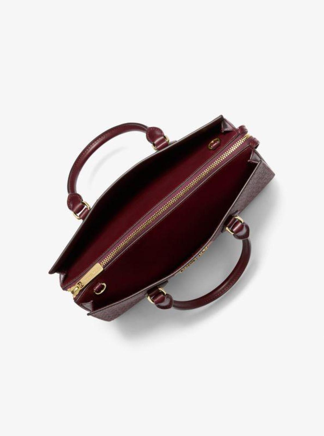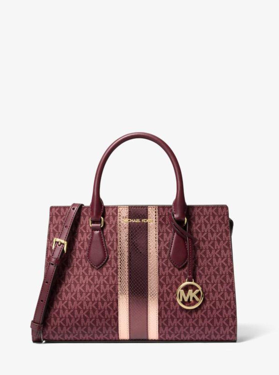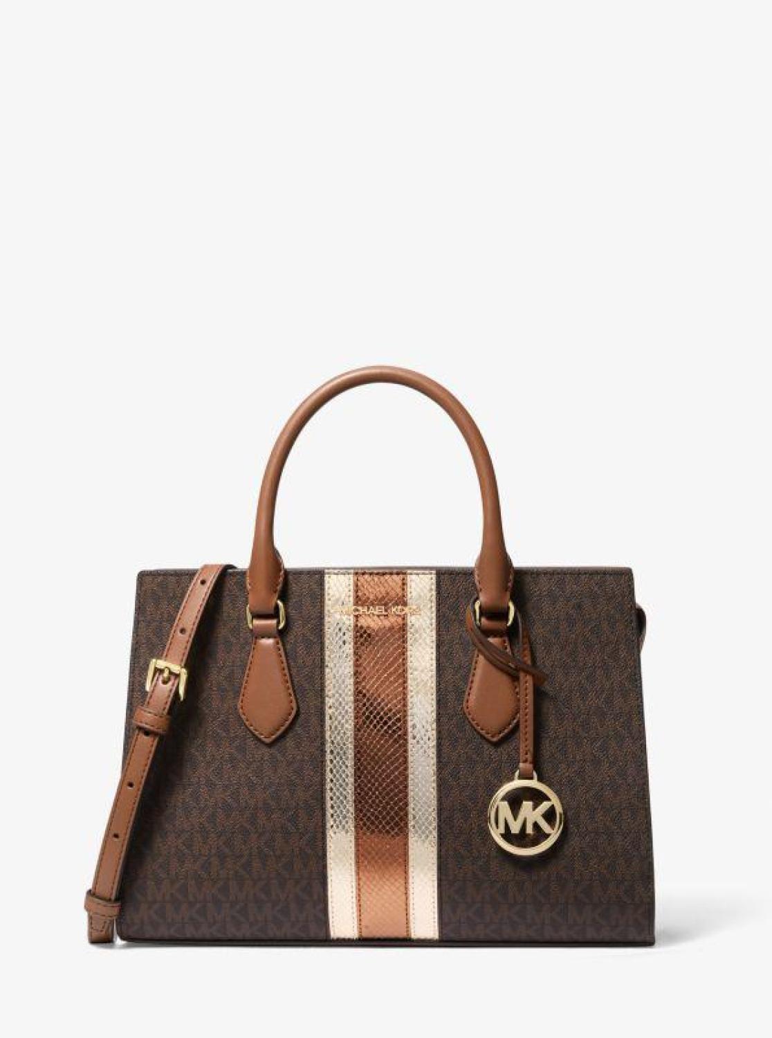 • Elegantly streamlined, the Sheila satchel is a classic style you can carry all day and into the night. It’s crafted from our Signature logo print with a metallic snake-embossed stripe at the center for a touch of glamour. With minimal hardware, it has internal pockets for organizing your belongings. Carry it by the top handle, or attach the included shoulder strap to wear it crossbody.